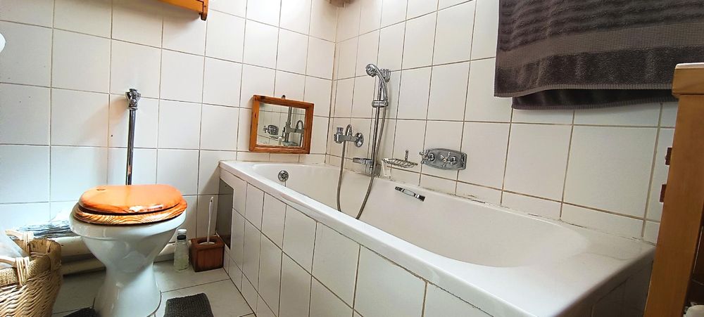 The heart of the home, the kitchen, exudes a warm, farm-like ambiance. It’s equipped with a gas hob and eye-level oven, perfect for preparing hearty meals together. Step through the back door to find a private courtyard and a separate laundry room—ideal for keeping the day-to-day organized.