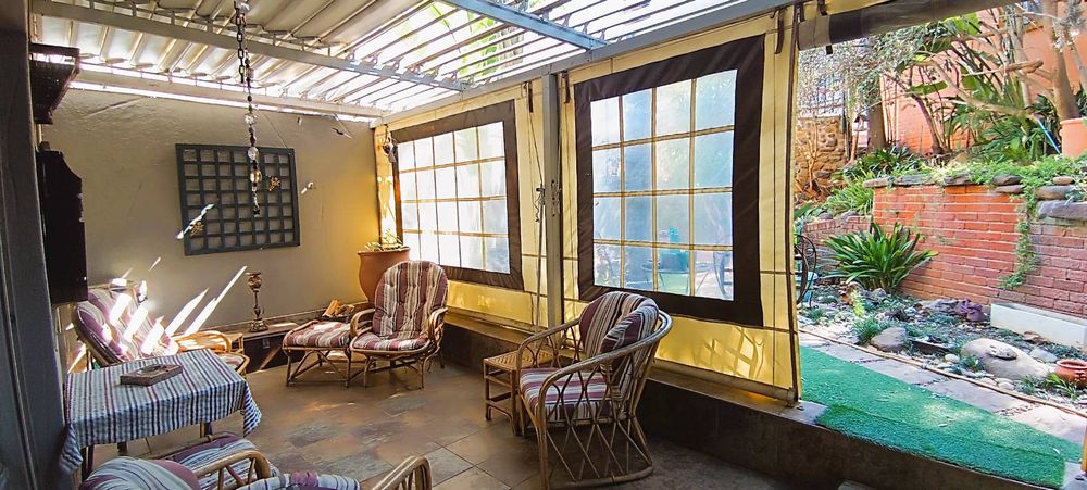 From the lounge, step out onto a private patio enclosed with a louvre roof and canvases, complete with a built-in braai—perfect for those weekend barbecues. This patio seamlessly extends to a beautifully landscaped garden, equipped with irrigation, where your children can play, and you can relax in the tranquility of nature.