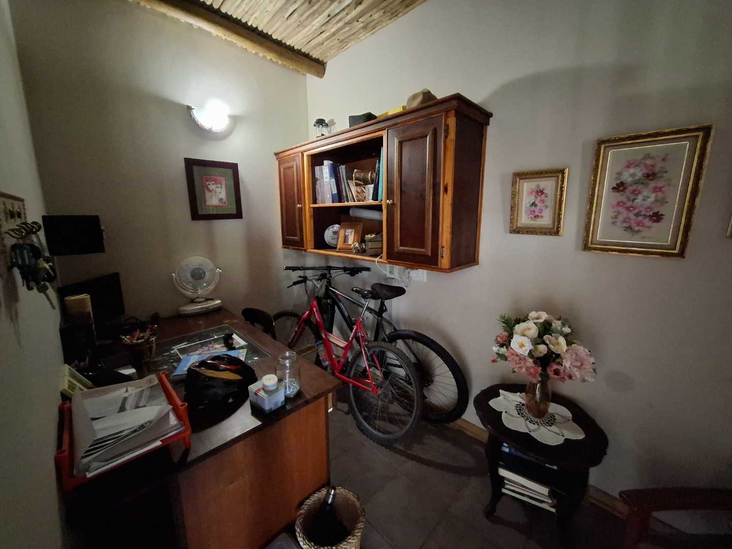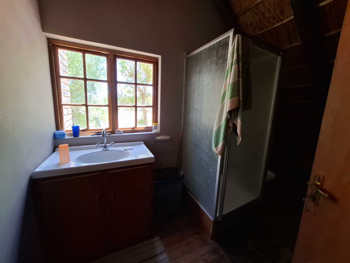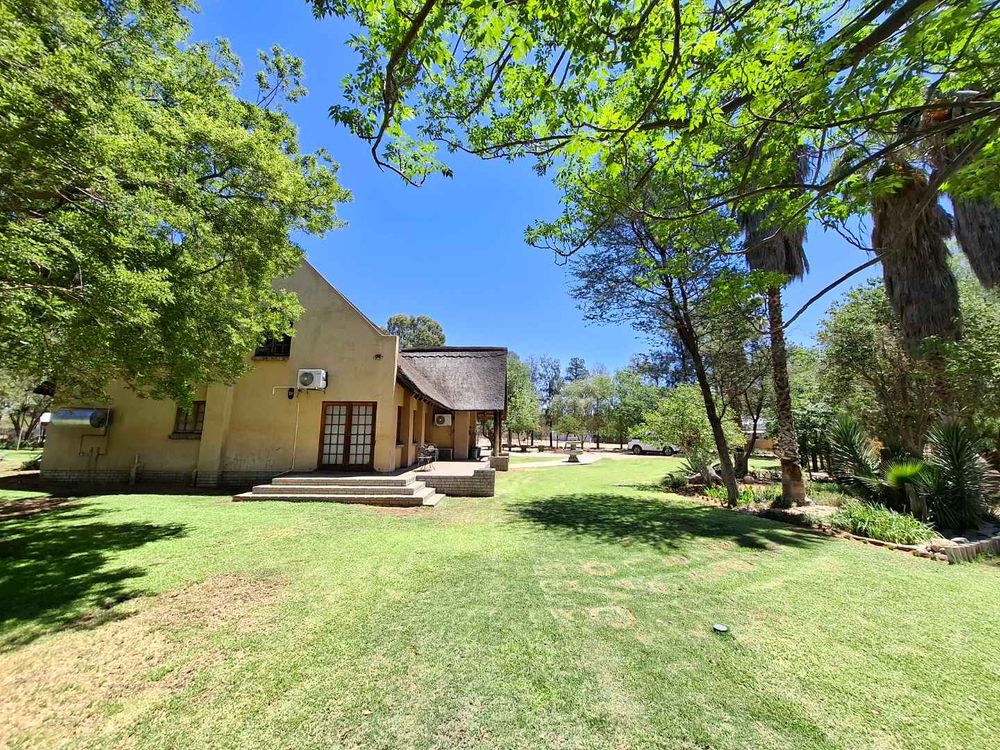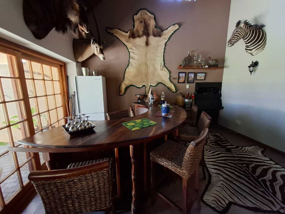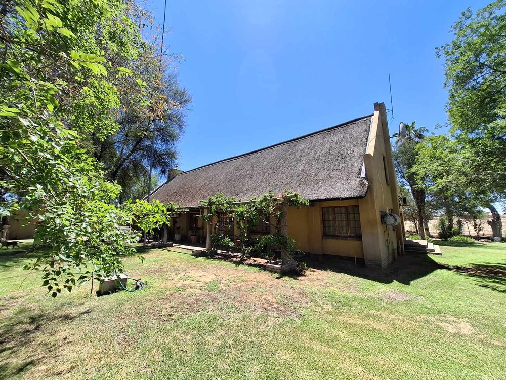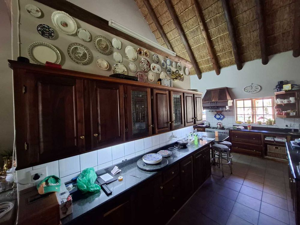 This impressive, thatched roof house on a 4712m2 erf, is an exquisite blend of elegance and comfort, offering a spacious living environment with modern conveniences. The home features high ceilings throughout, creating an airy and open atmosphere that enhances its charm. It boasts three well-sized bedrooms, each with ample natural light, three bathrooms, and a guest bathroom. Ample built in cupboards in the bedrooms and a walk-in closet in the main bedroom.
