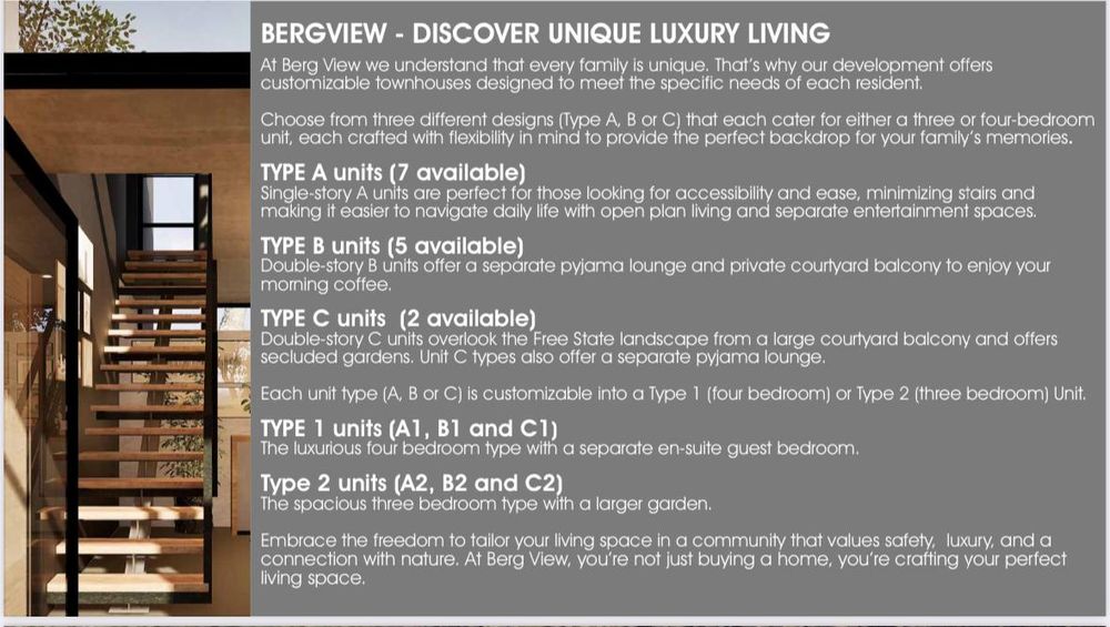 Embrace a life of luxury and tranquility at Bergendal Wildlife Estate, where modern living meets the beauty of nature. This exclusive townhouse development features customizable four-bedroom units designed to cater to the unique needs of your family. Choose from single or double-story layouts, each thoughtfully crafted with high-quality materials and premium finishes.