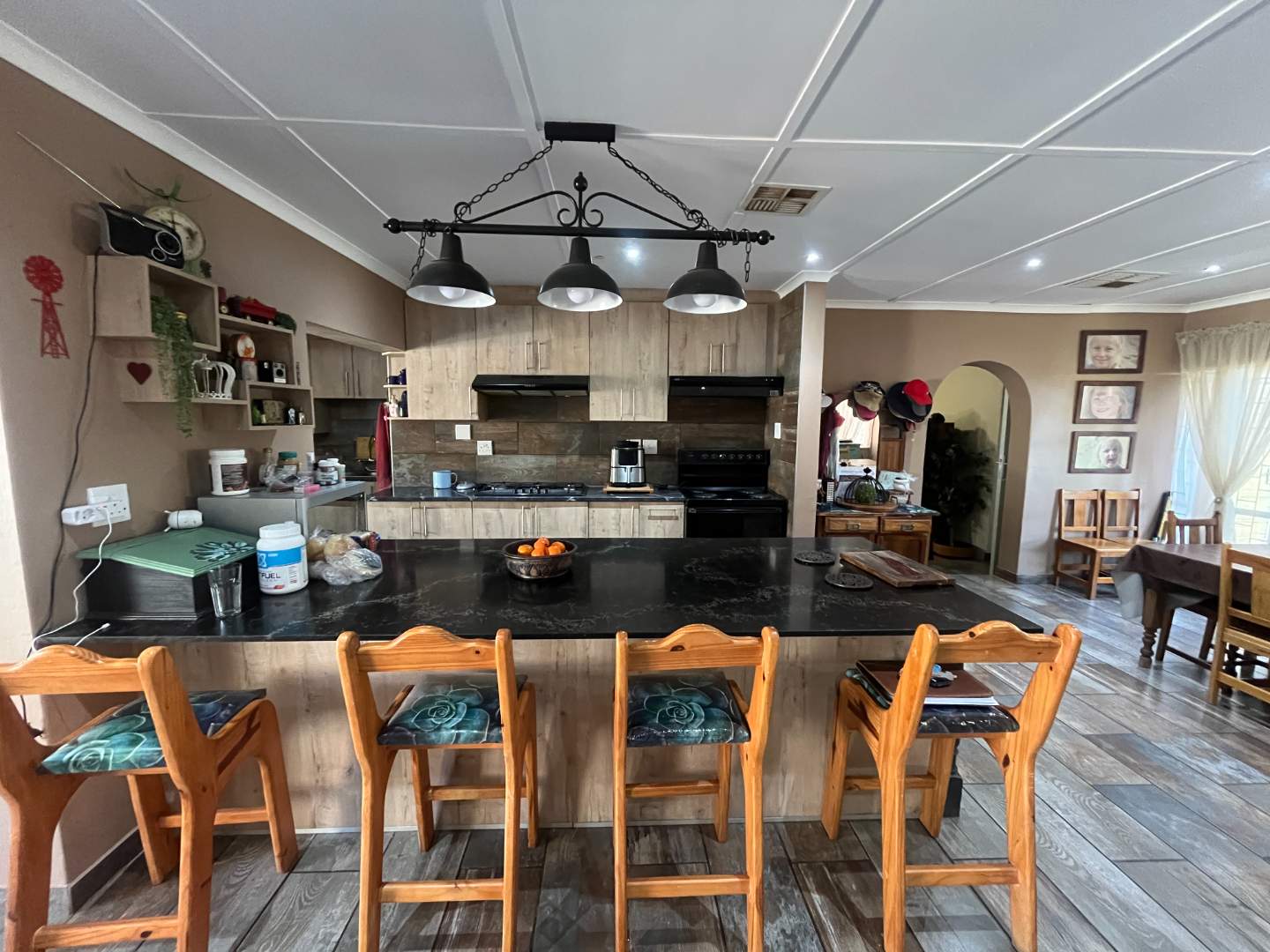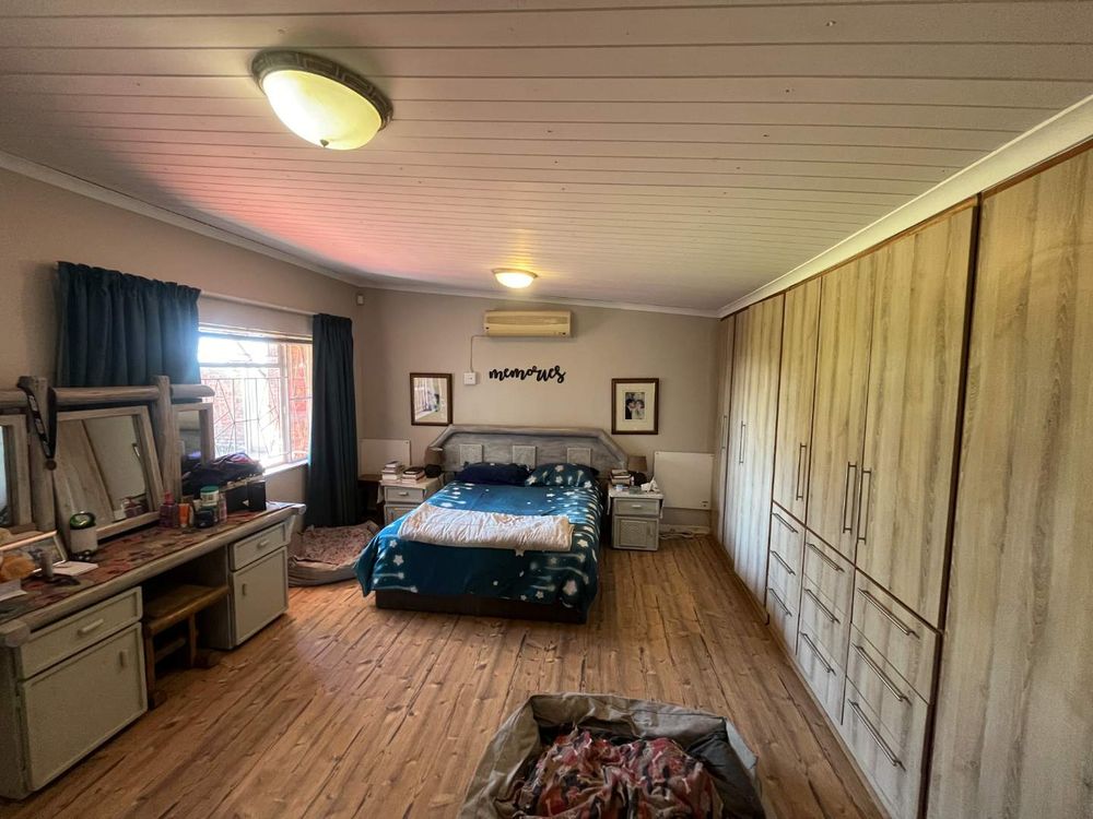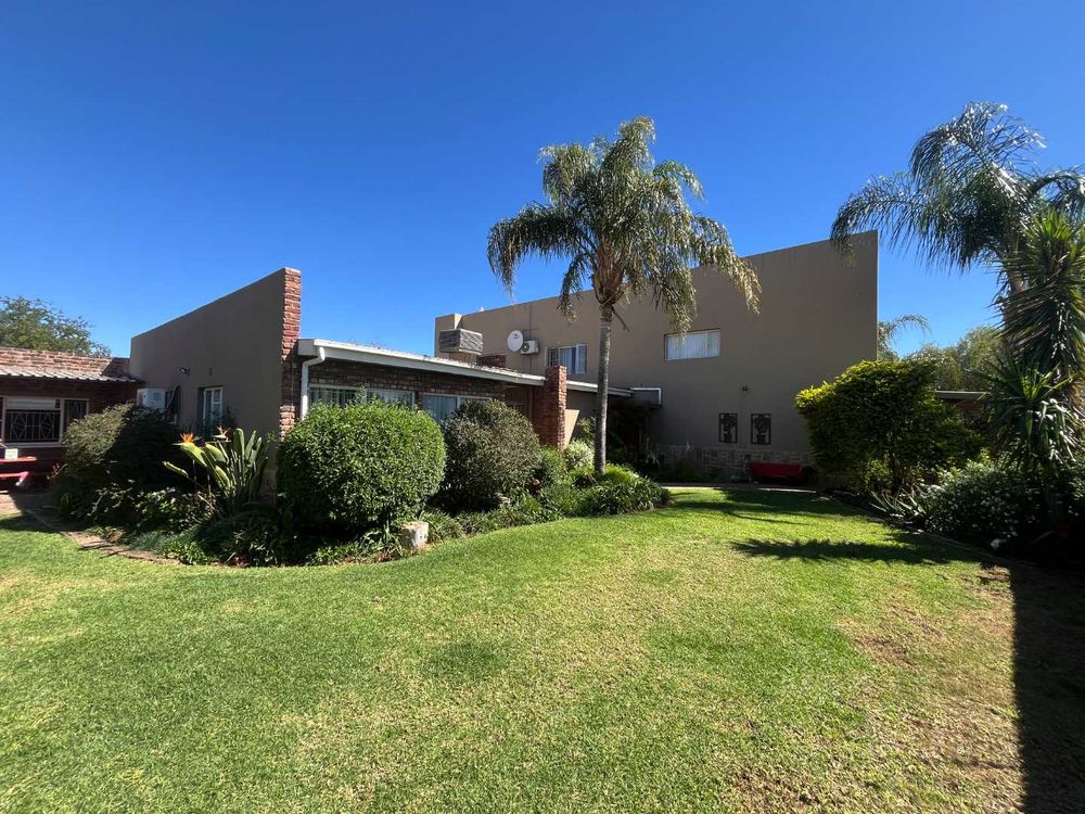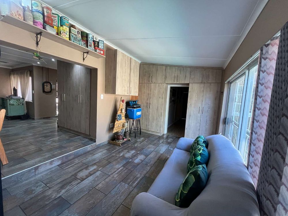 The open-plan living spaces flow effortlessly and create a warm and inviting atmosphere for family gatherings and special moments. The heart of the home is the newly renovated kitchen — modern, stylish and designed with practicality in mind. With its granite tops, ample cupboards, gas hob, electric stove and separate scullery, it’s a space where cooking and connection come naturally. The dining and living areas open through sliding doors to the sparkling blue swimming pool, perfect for entertaining on sunny days or relaxing with loved ones. Separate laundry room with built-in cupboards.