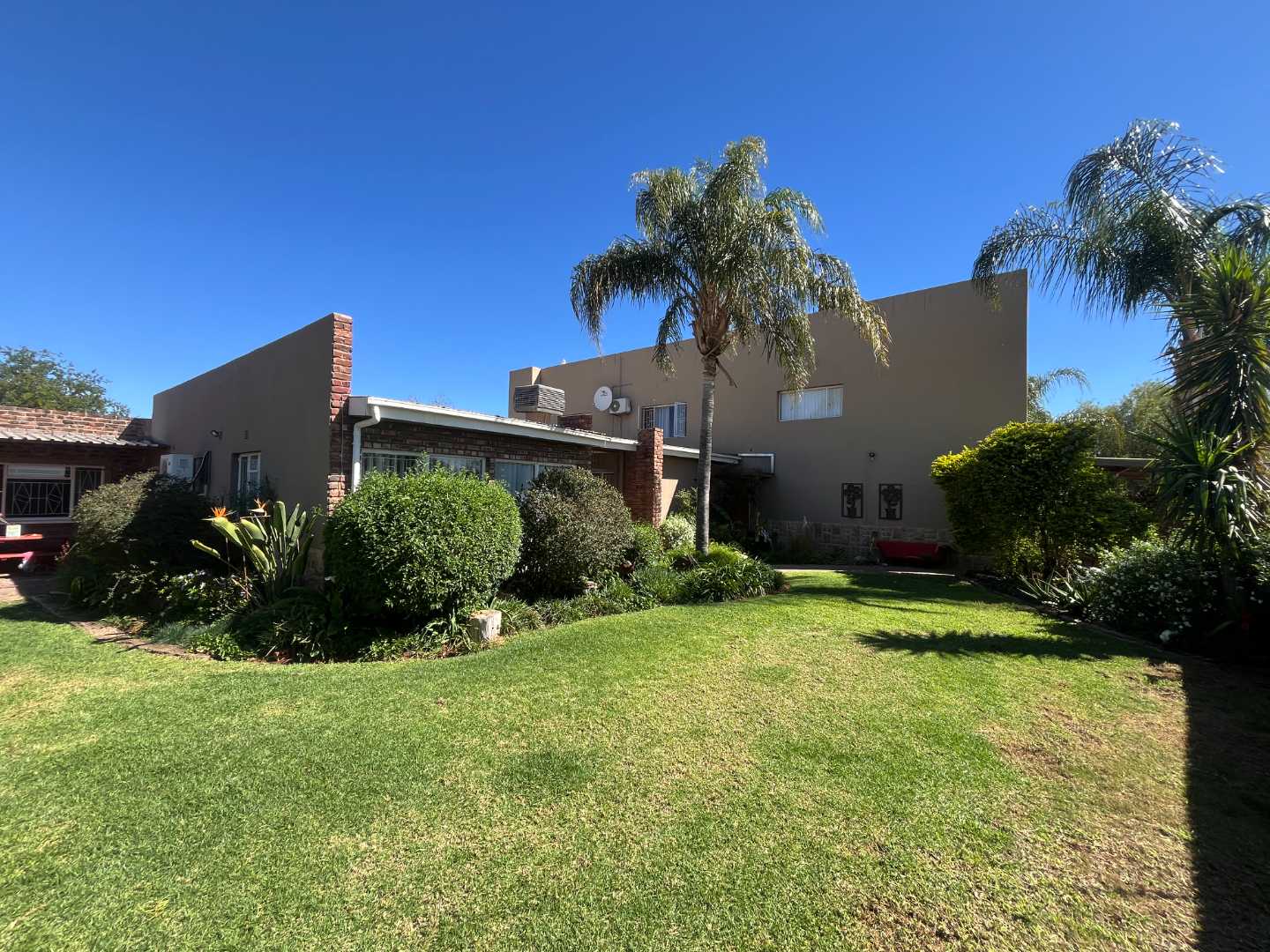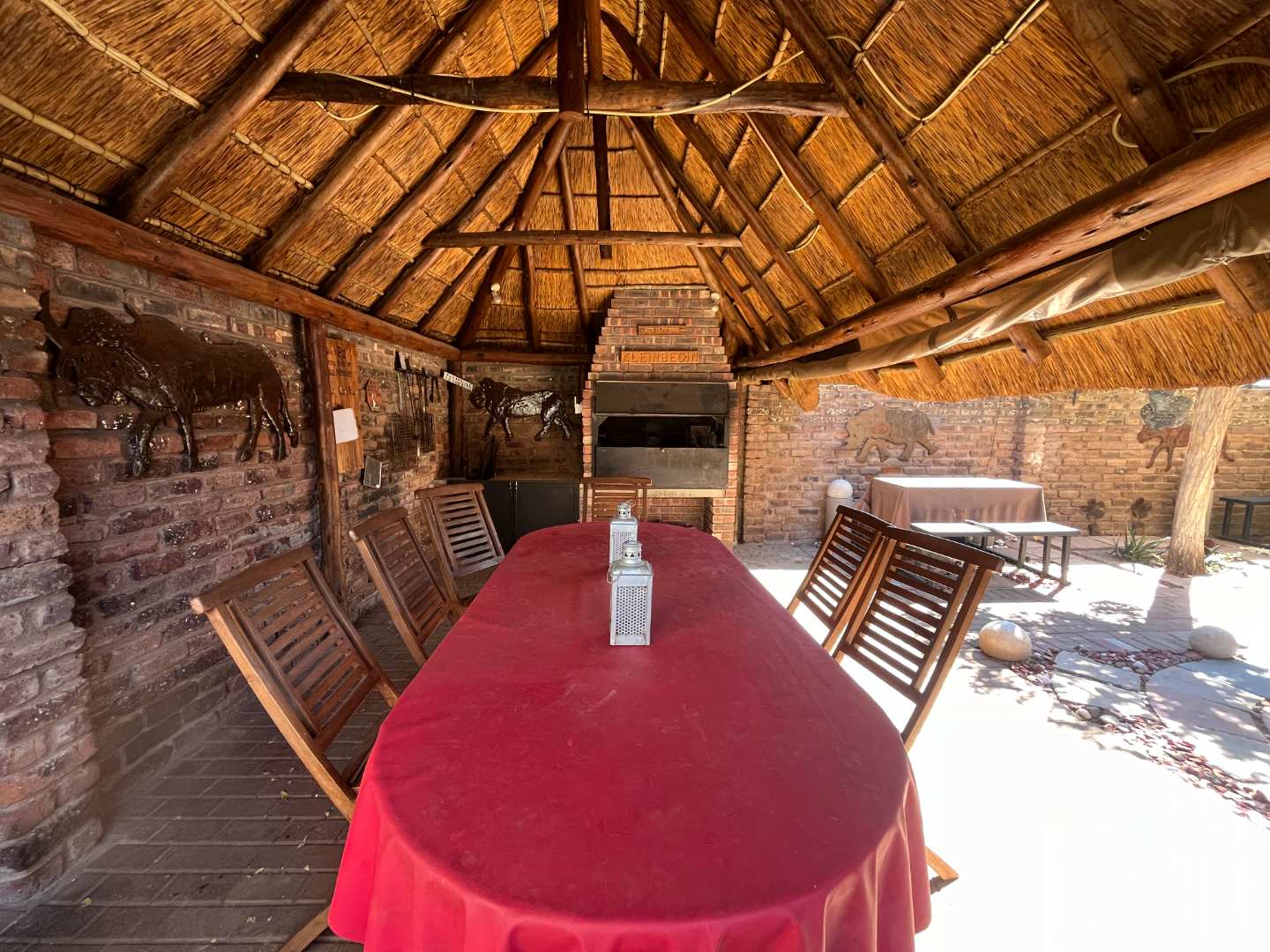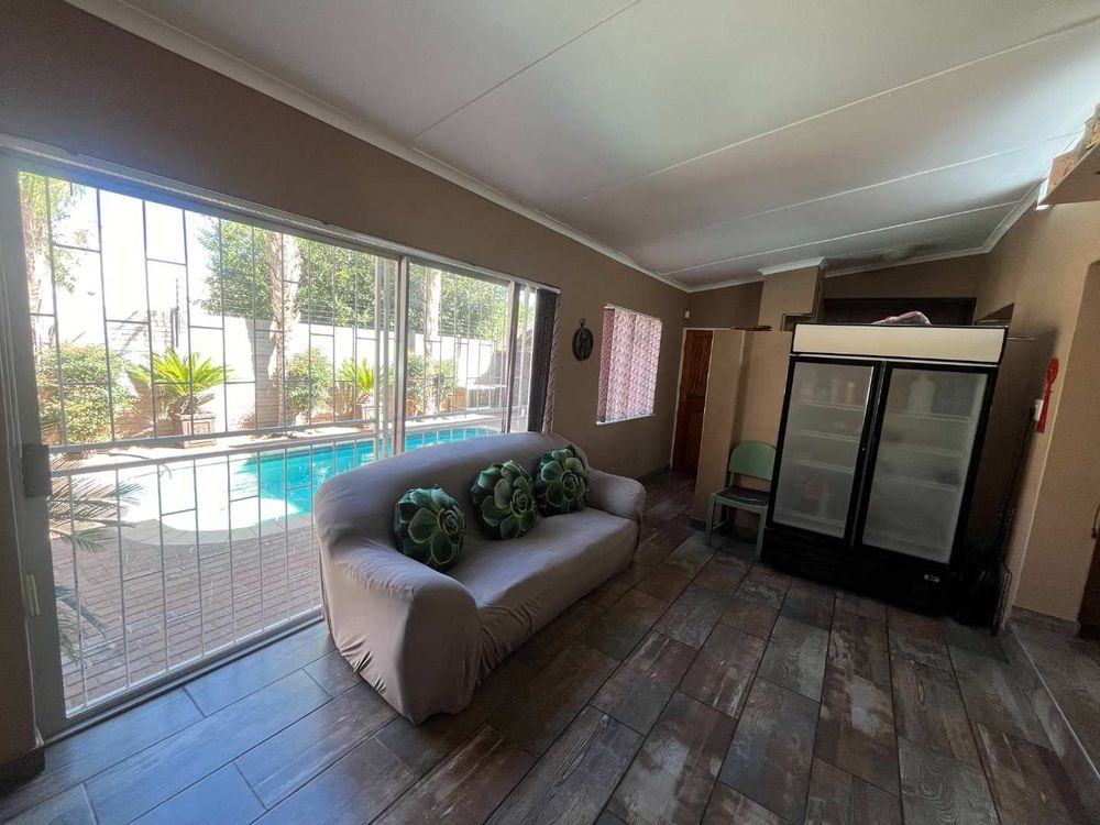 The house is fitted with a central water cooler and split-unit air conditioners in selected rooms, ensuring comfort throughout the year. Outside, the garden is lush and beautifully kept, with an automated irrigation system that makes maintenance easy. The thatched roof lapa by the pool is the perfect place to entertain friends and family or simply enjoy a quiet evening outdoors.