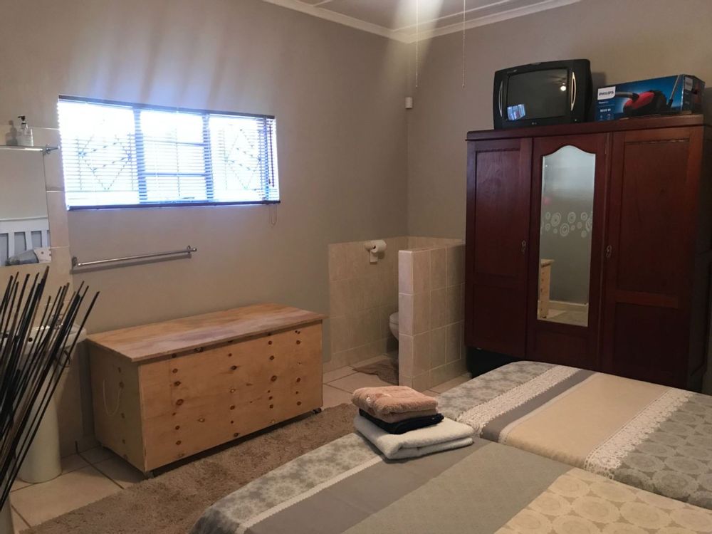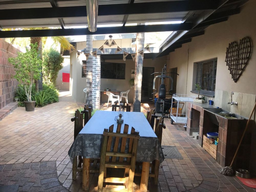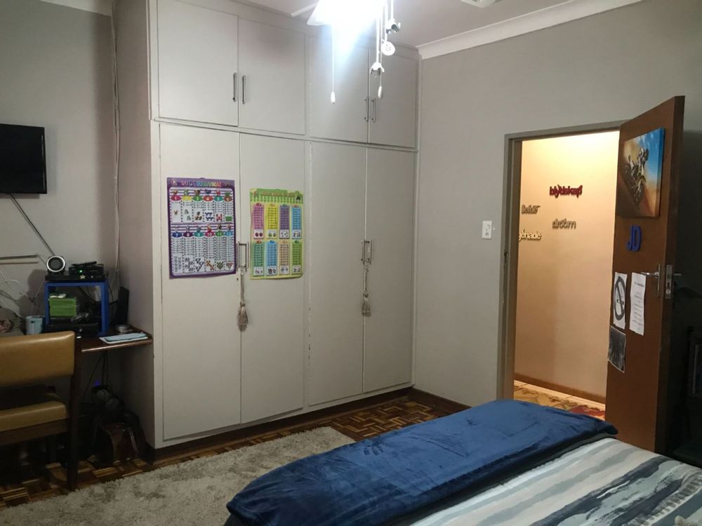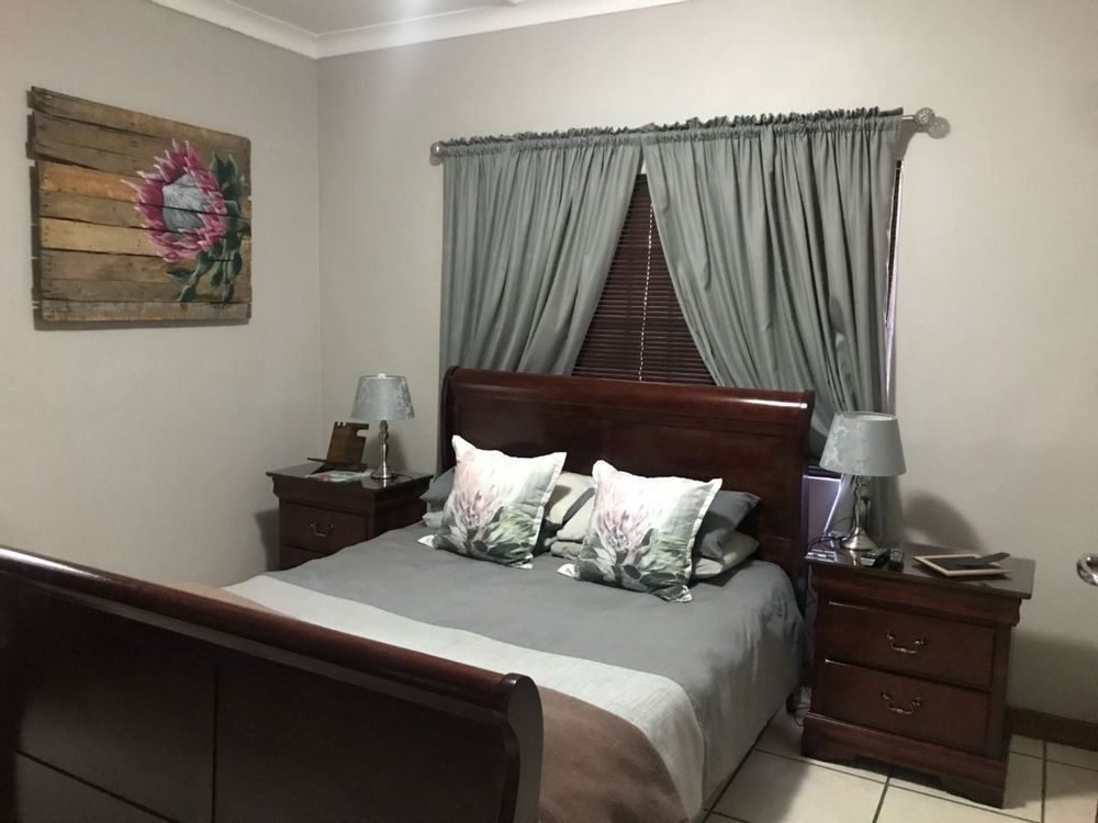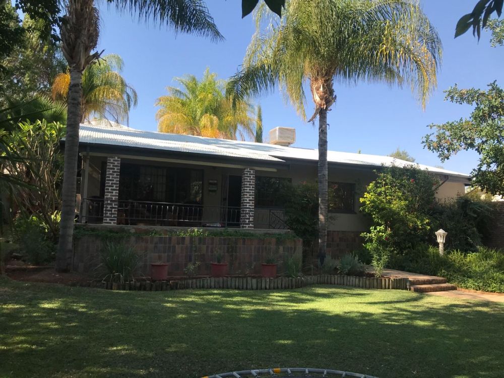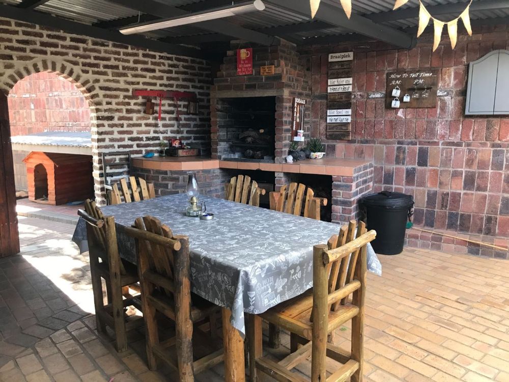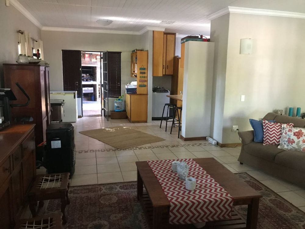 The open plan family and dining room are connected to the kitchen with ample cupboards, eye level oven, electric hob, extractor fan and breakfast nook. The kitchen leads to an undercover patio with built-in braai and entertainment area. In front of the house is a lovely porch where you can sit and enjoy the spectacular view of the well maintained garden. The property has 3 garages and lots of extra parking space, an outside toilet and safety features like electric fencing, electric motor gate, burglar bars, alarm system and security gates. The house has a water cooler, cooling fans in 2 bedrooms and a split unit in the open plan living areas.