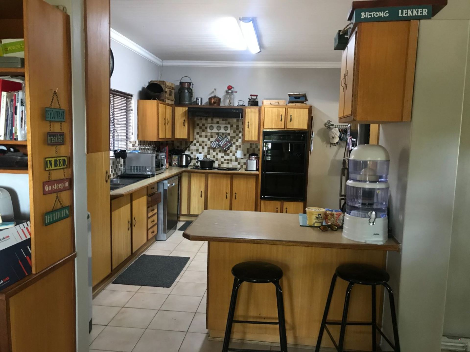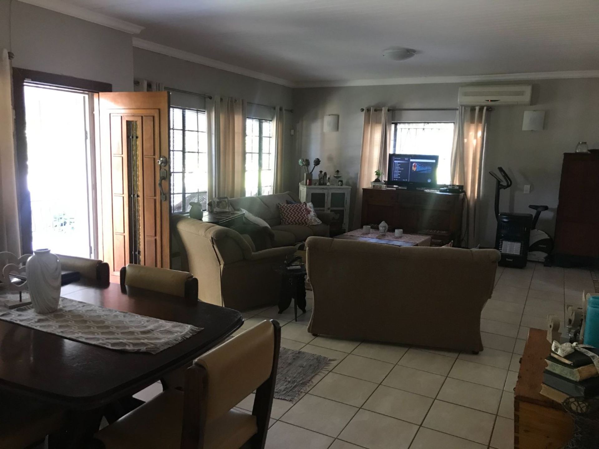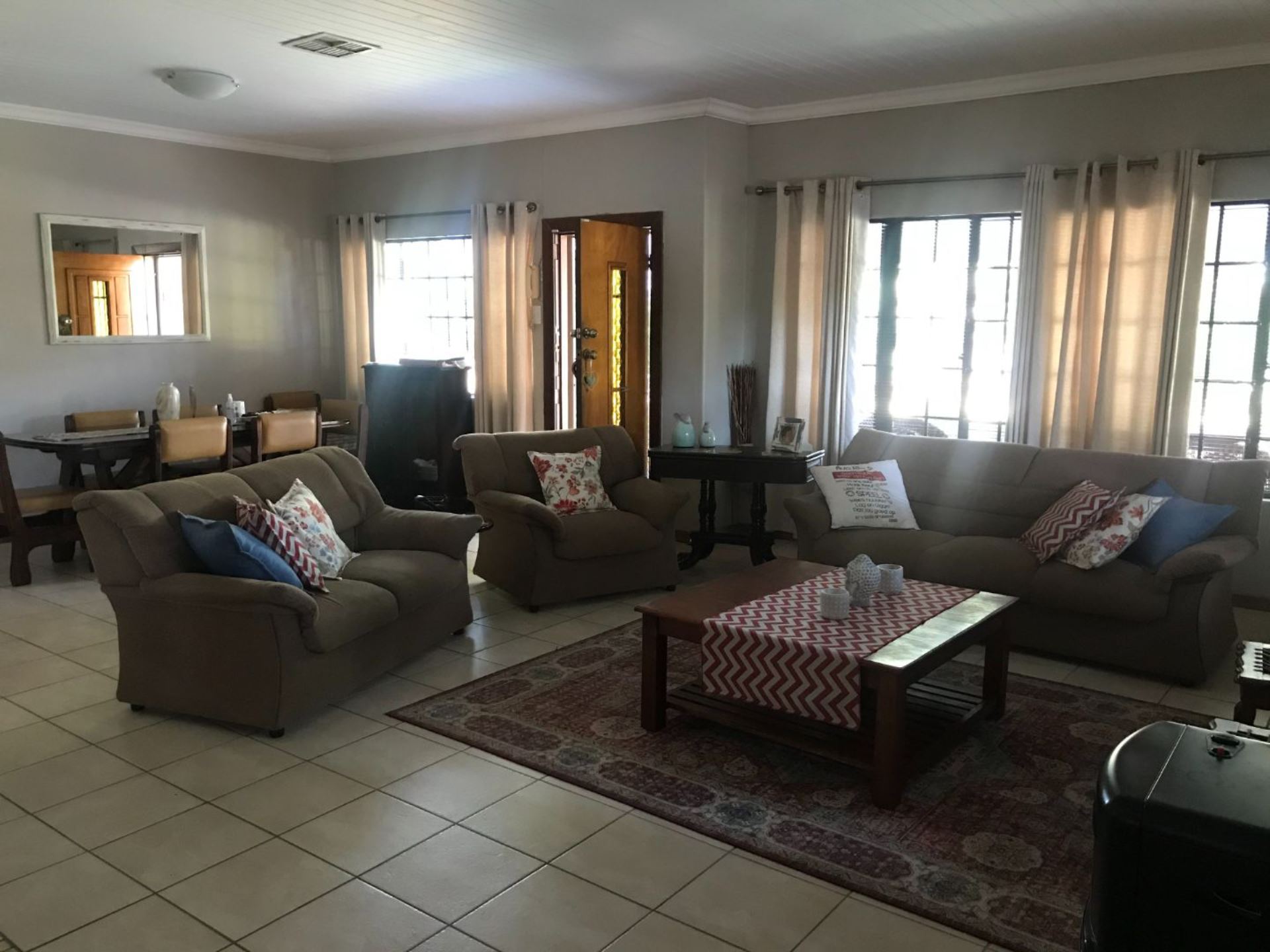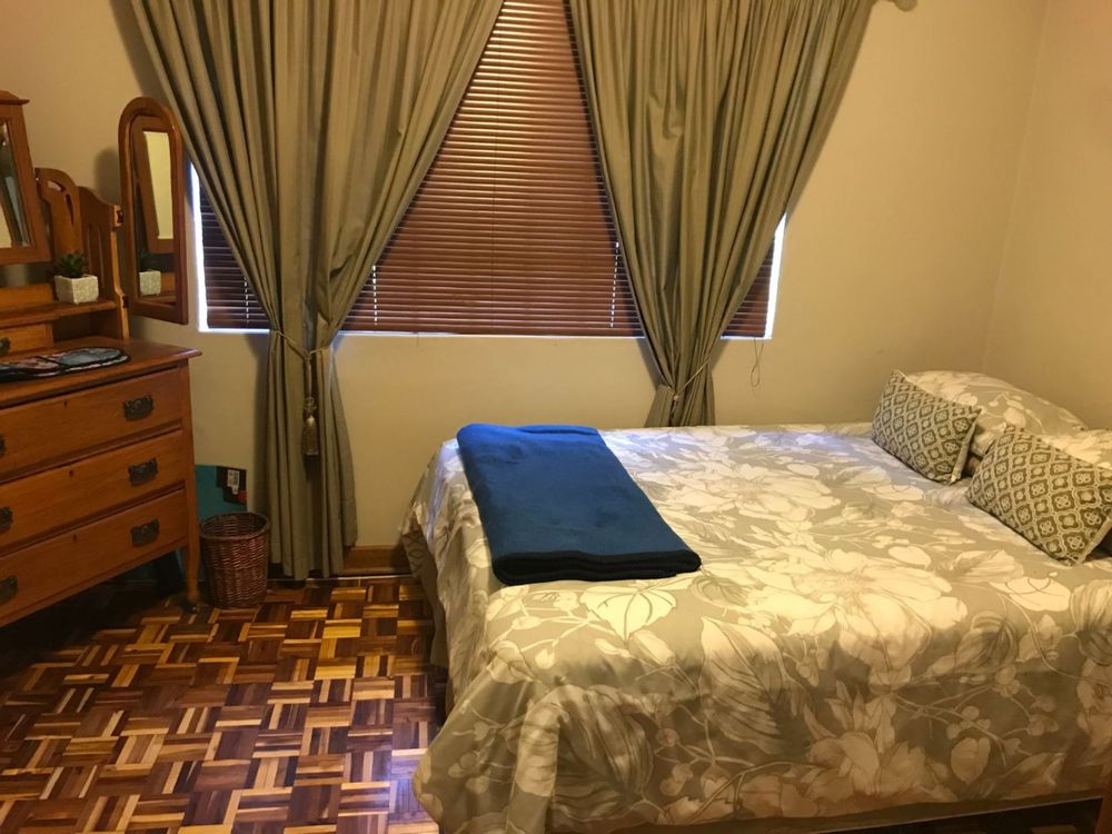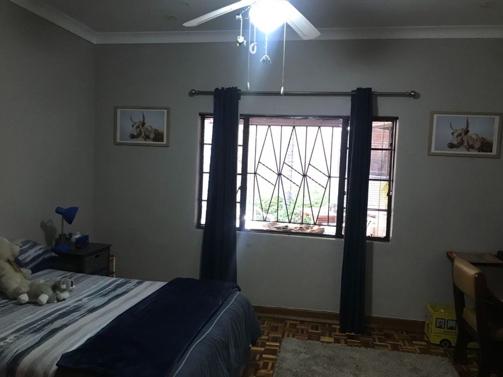 The open plan family and dining room are connected to the kitchen with ample cupboards, eye level oven, electric hob, extractor fan and breakfast nook. The kitchen leads to an undercover patio with built-in braai and entertainment area. In front of the house is a lovely porch where you can sit and enjoy the spectacular view of the well maintained garden. The property has 3 garages and lots of extra parking space, an outside toilet and safety features like electric fencing, electric motor gate, burglar bars, alarm system and security gates. The house has a water cooler, cooling fans in 2 bedrooms and a split unit in the open plan living areas.