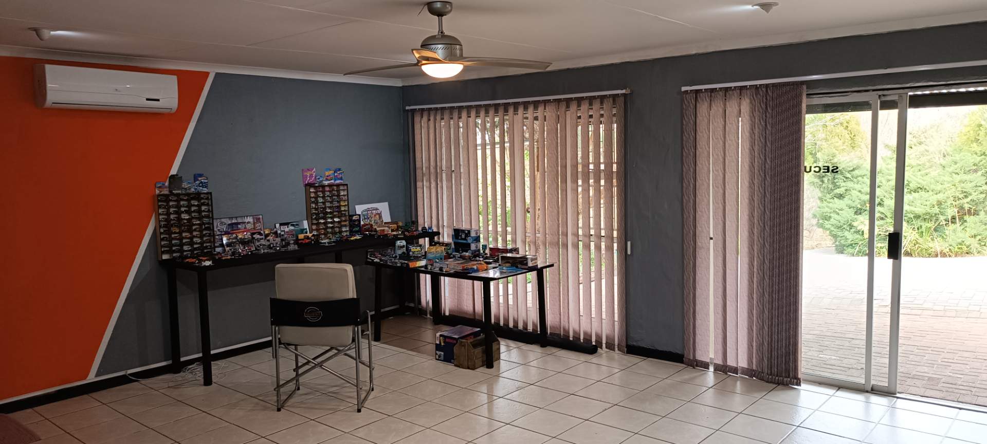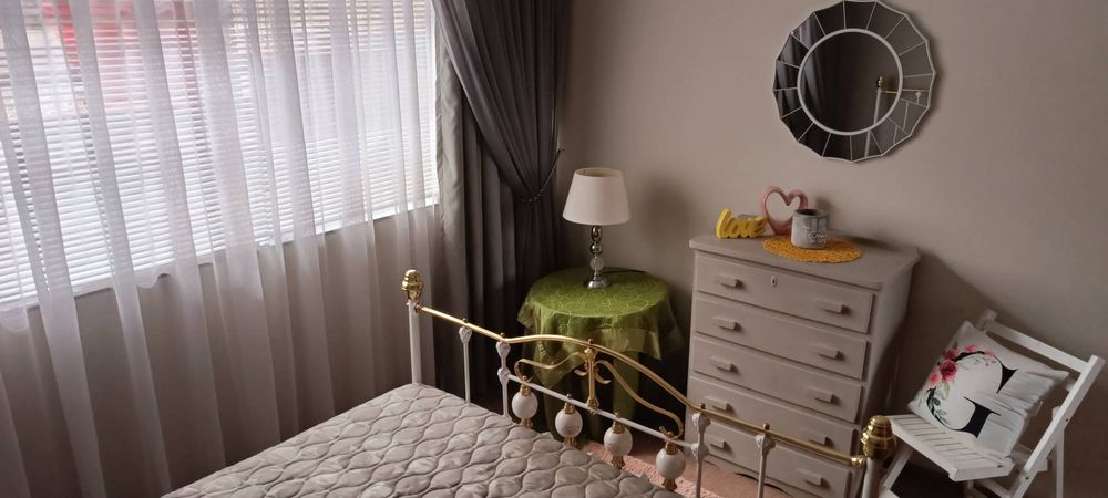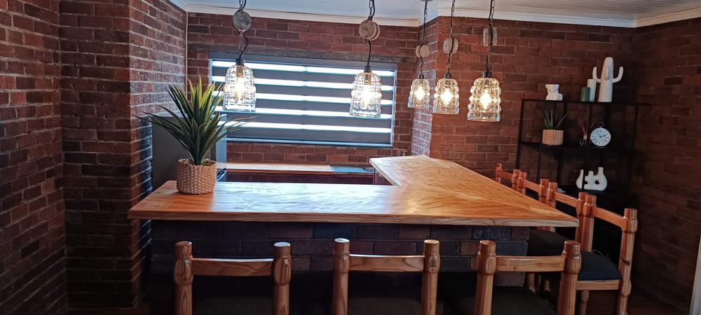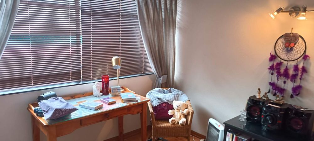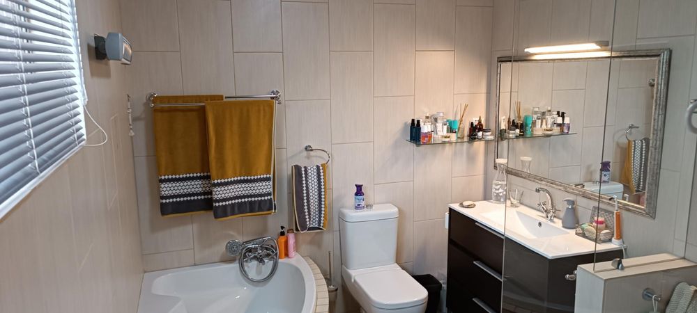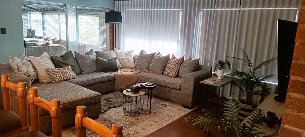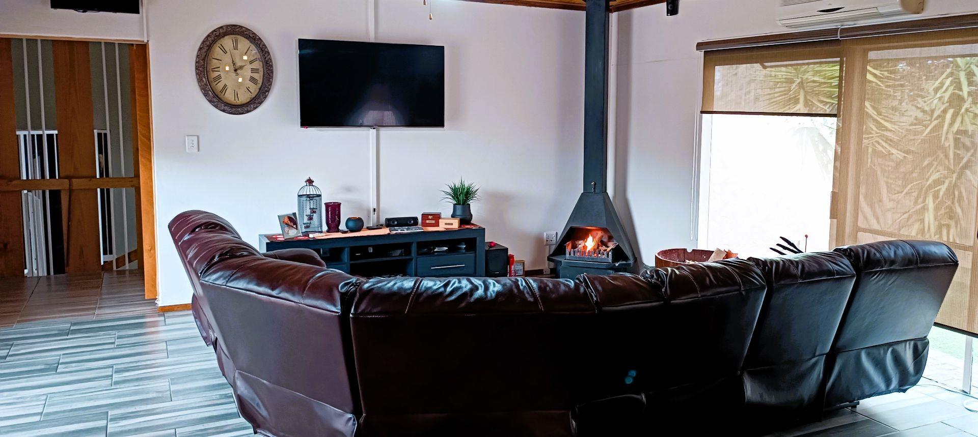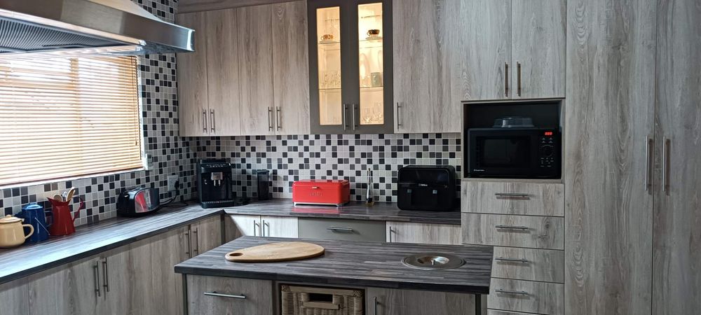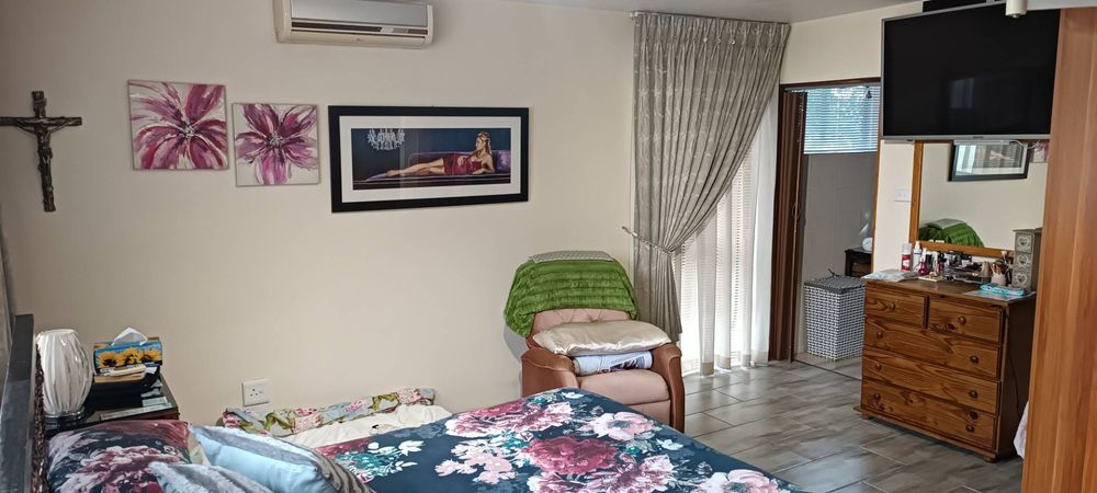 The house boasts a huge entertainment room with a built-in braai. Sliding doors from this room lead to a covered patio and garden area. (This room can also be used as an additional bedroom)