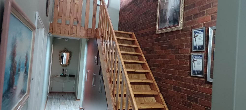 There's a second entertainment room upstairs with a built-in braai that overlooks a sparkling swimming pool, offering a great space for relaxation and socializing.