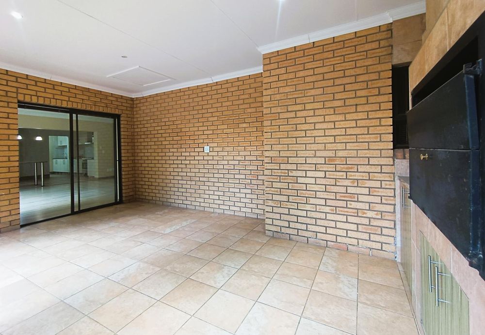 Sliding doors lead seamlessly from the living area to a spacious patio with a built-in braai, overlooking a lush, green garden that is perfect for entertaining or relaxed family living.