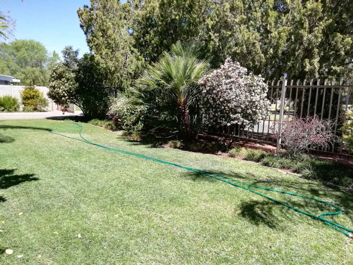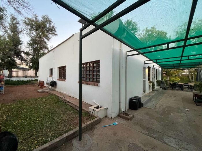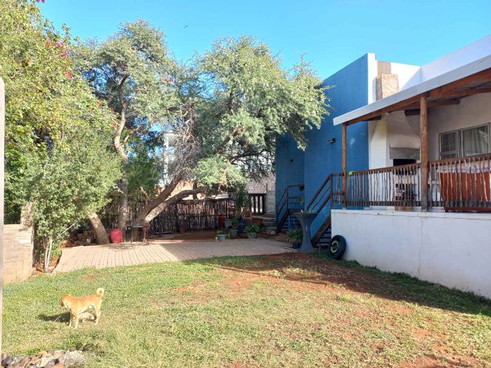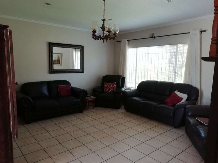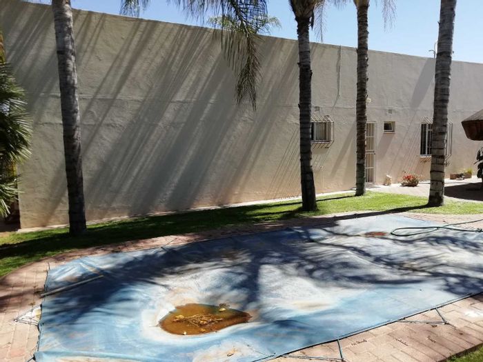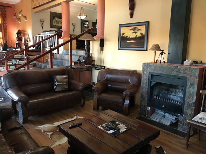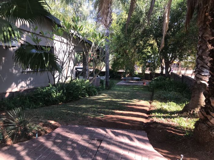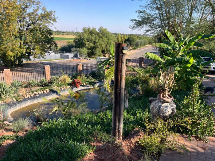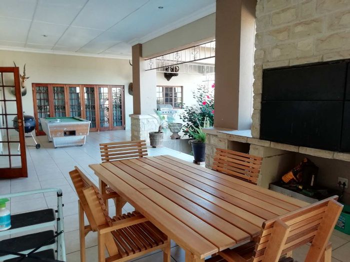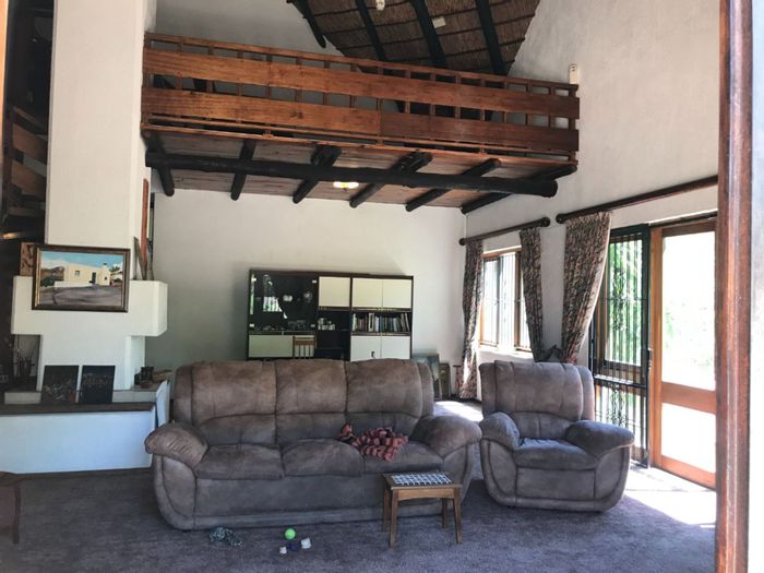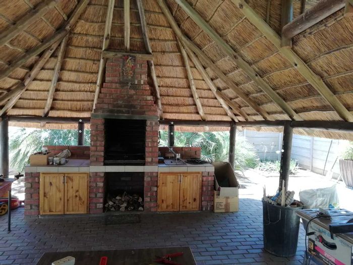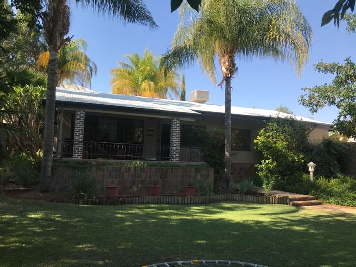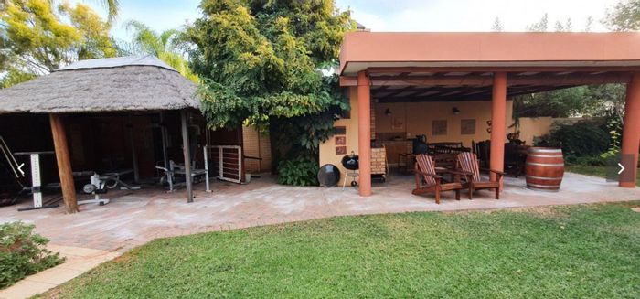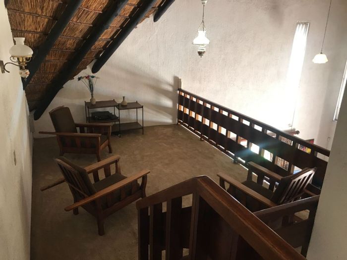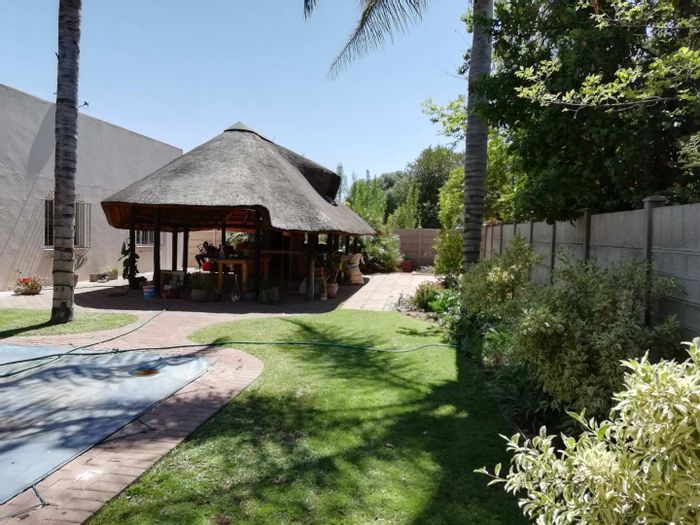 A meticulously maintained, unique thatched home with open spaces, large windows, and lush gardens, perfect for entertaining in Upington.