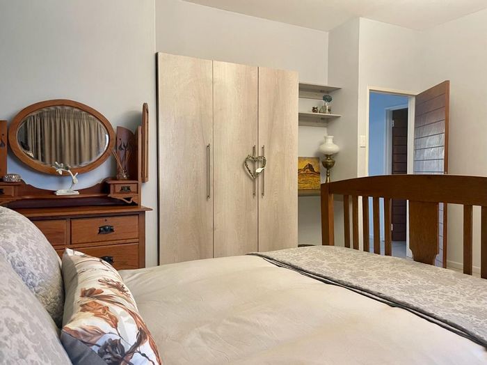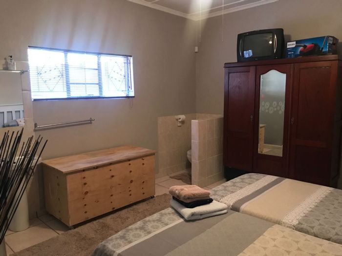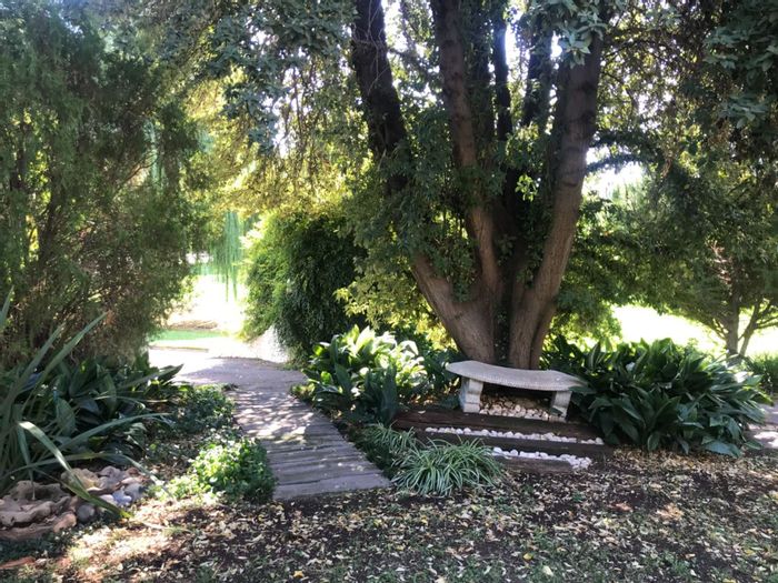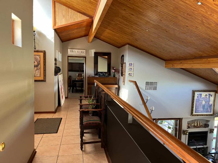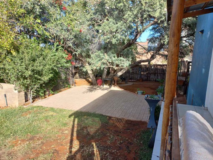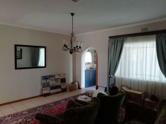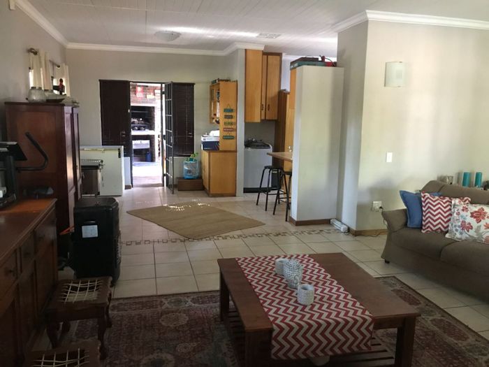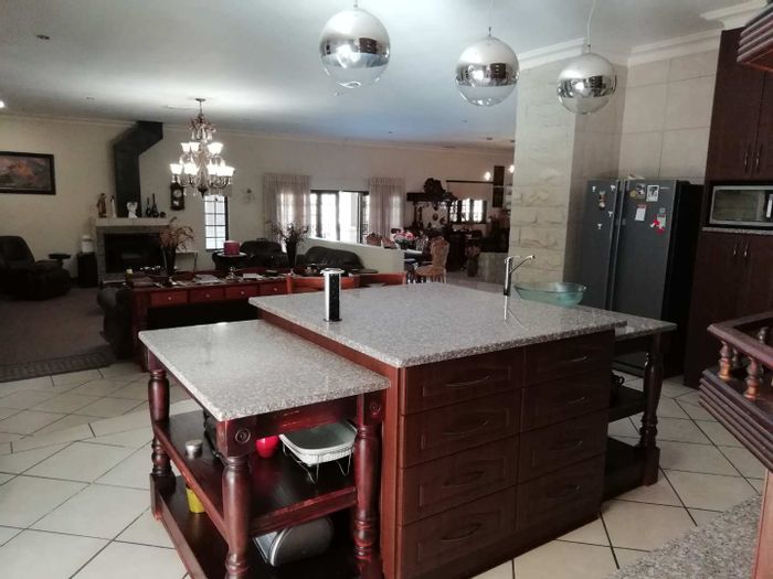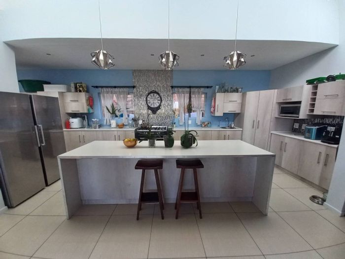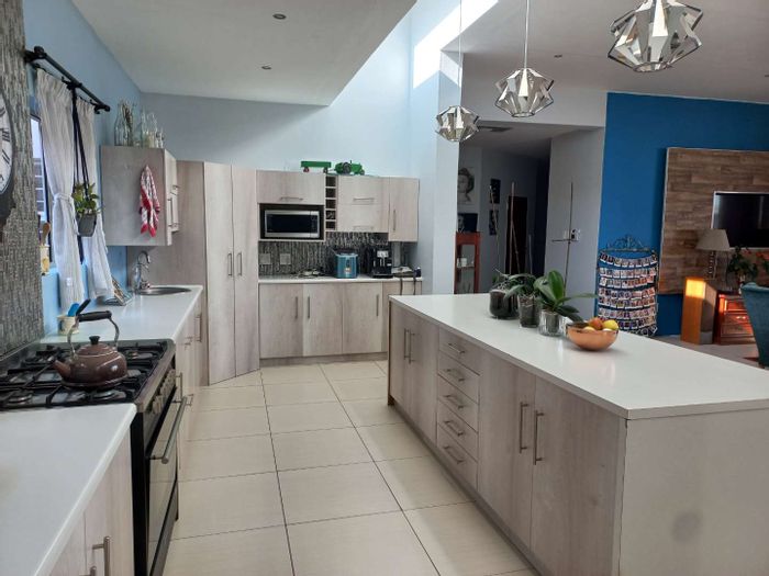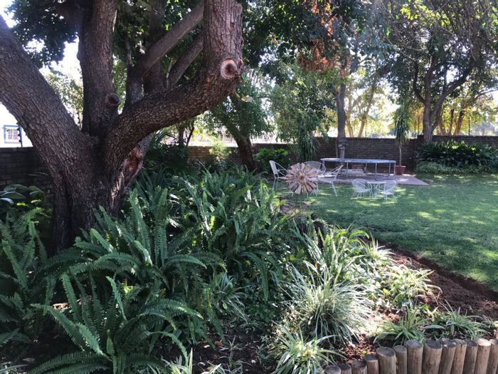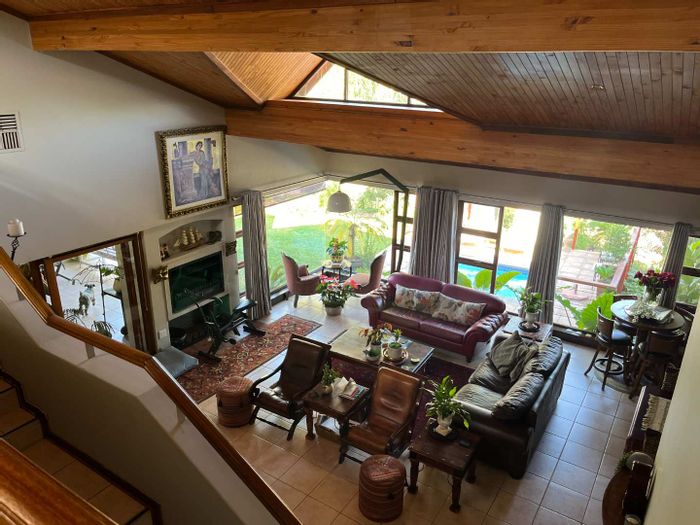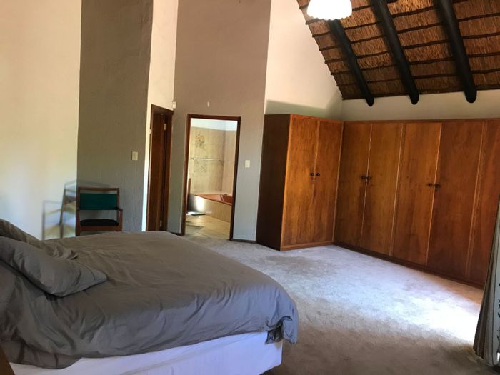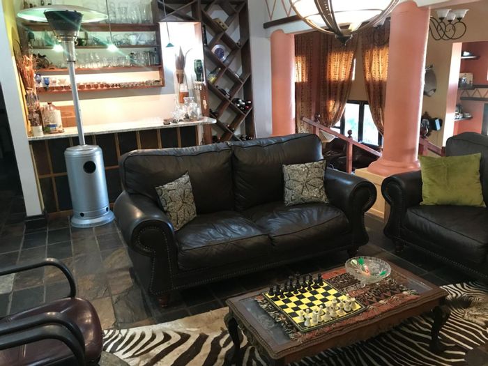 A meticulously maintained, unique thatched home with open spaces, large windows, and lush gardens, perfect for entertaining in Upington.