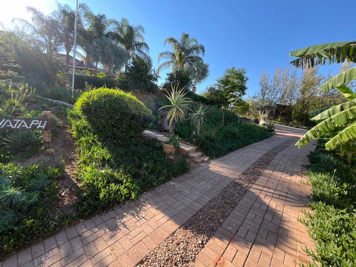 Bali-style family home in Upington with tropical gardens, 4 bedrooms with en-suites, open-plan living area, covered braai patio, and heated splash pool.