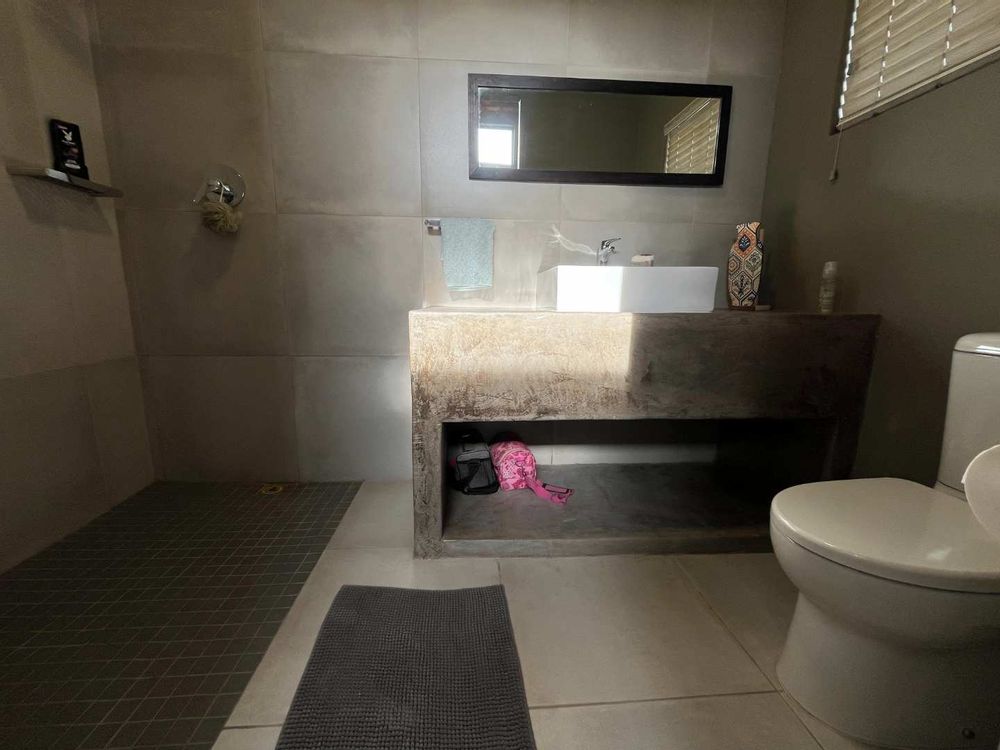 Each of the three bedrooms is generously sized and fitted with built-in cupboards. All bedrooms have their own modern en-suite bathrooms, with the main en-suite boasting a full bathroom setup, including a bath, shower, basin, and toilet. The home is neatly tiled throughout for a clean, cohesive look.