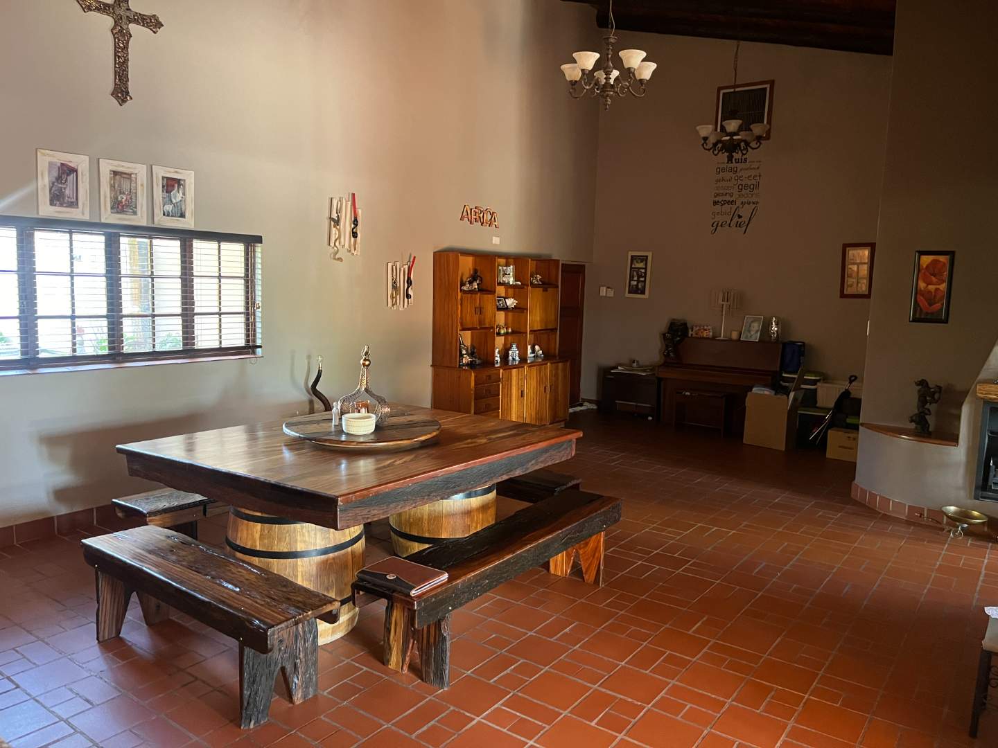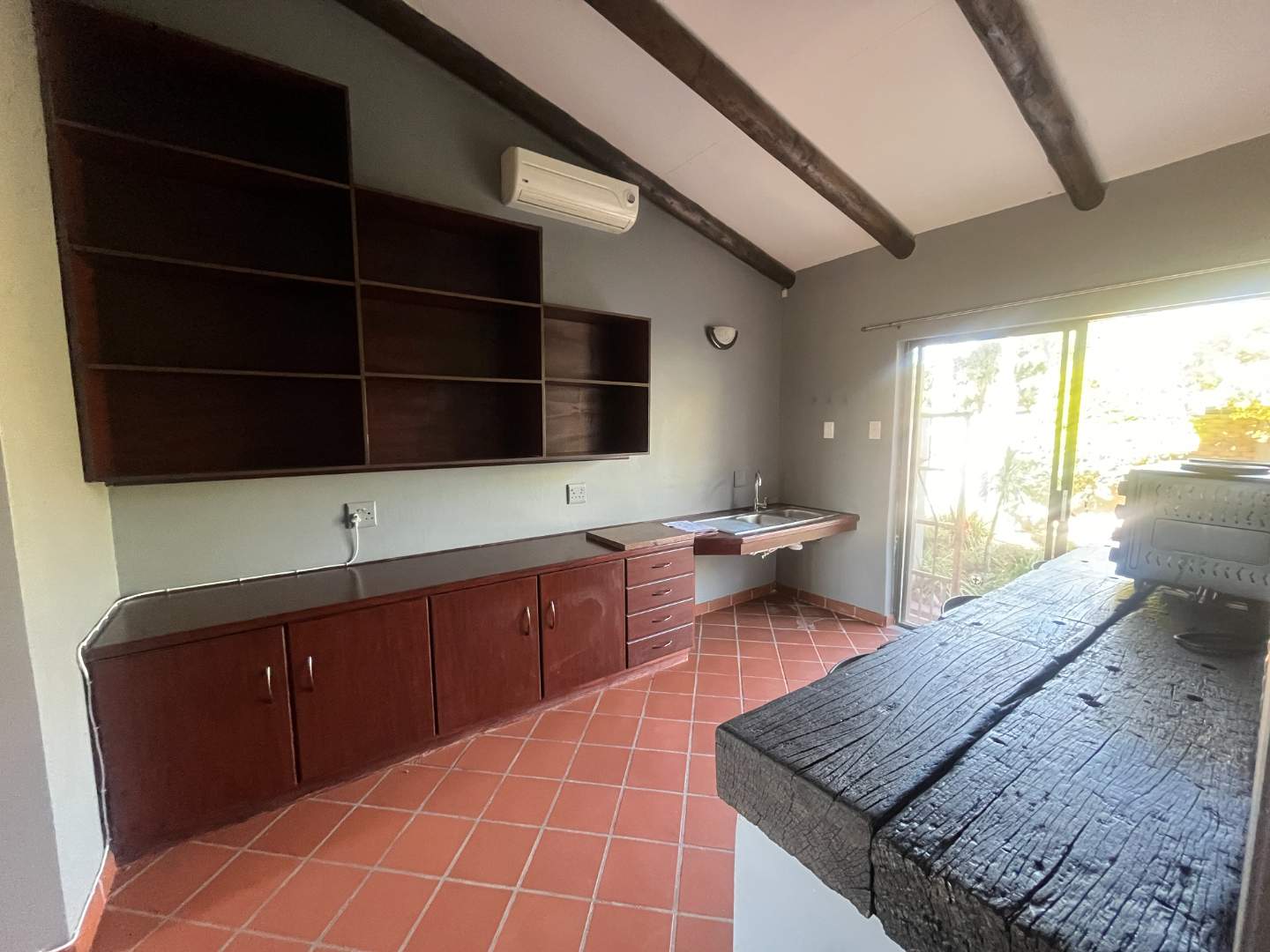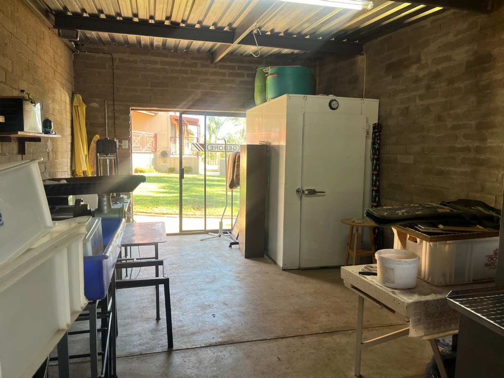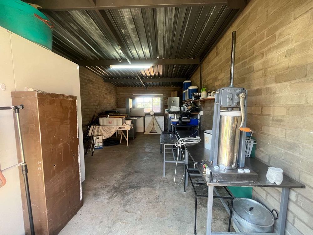 A work room with a cold room where you can process your meat if you are a hunter.
