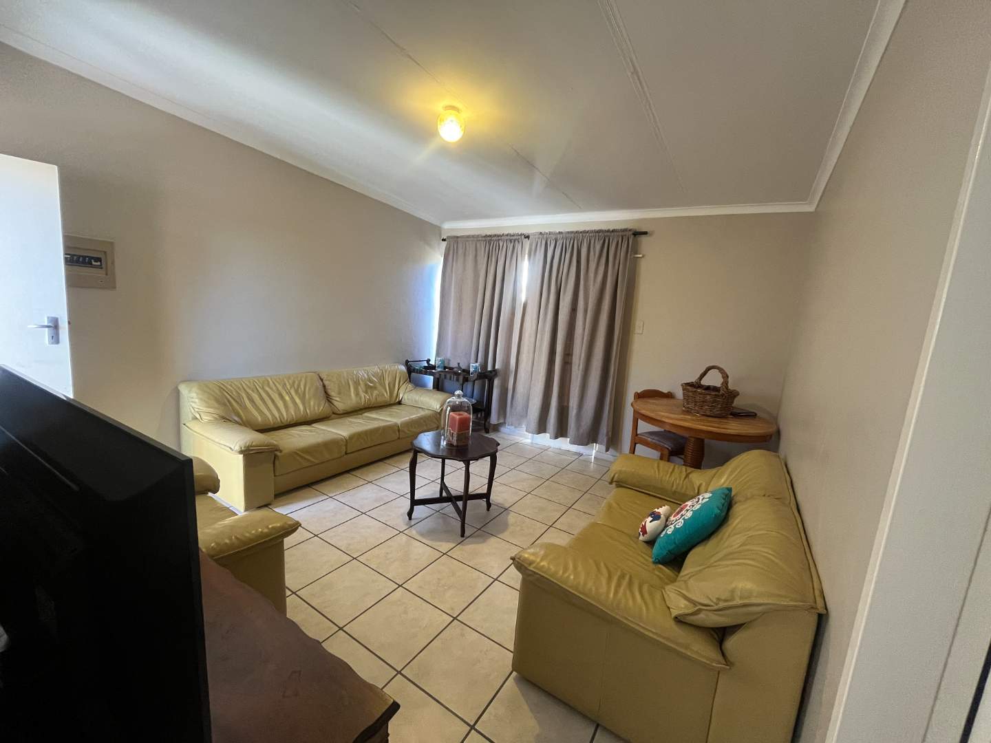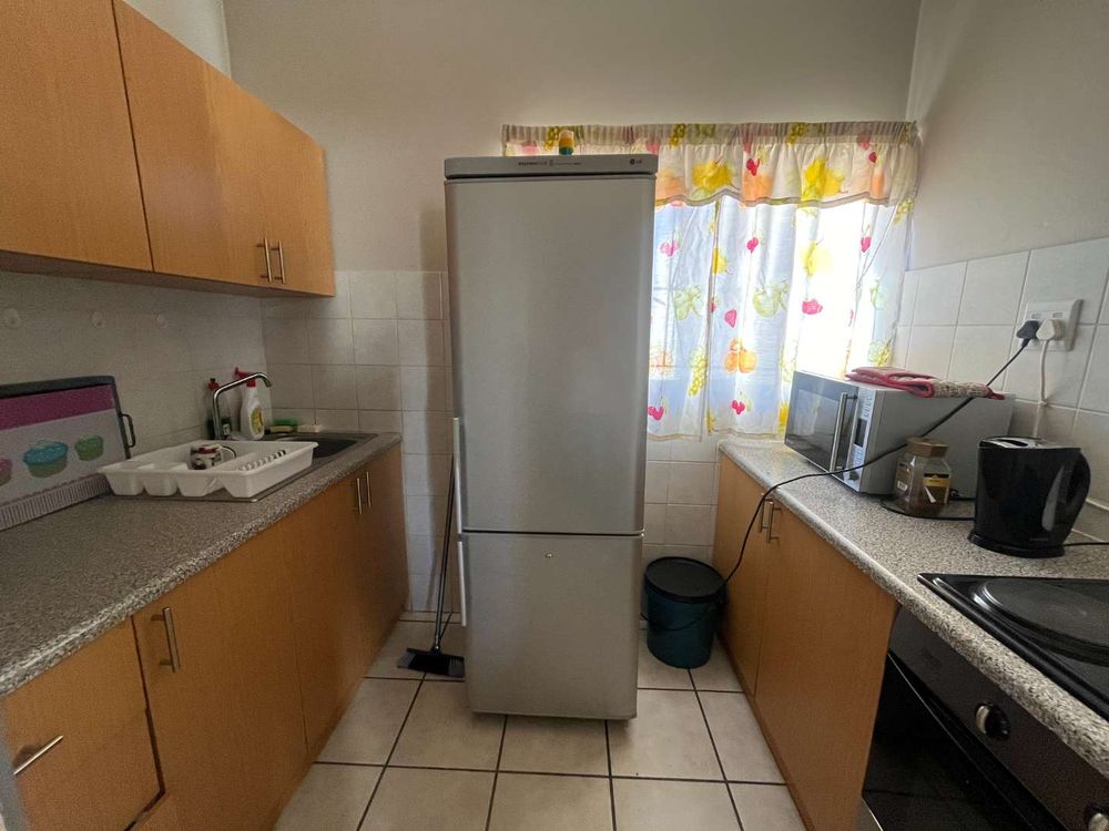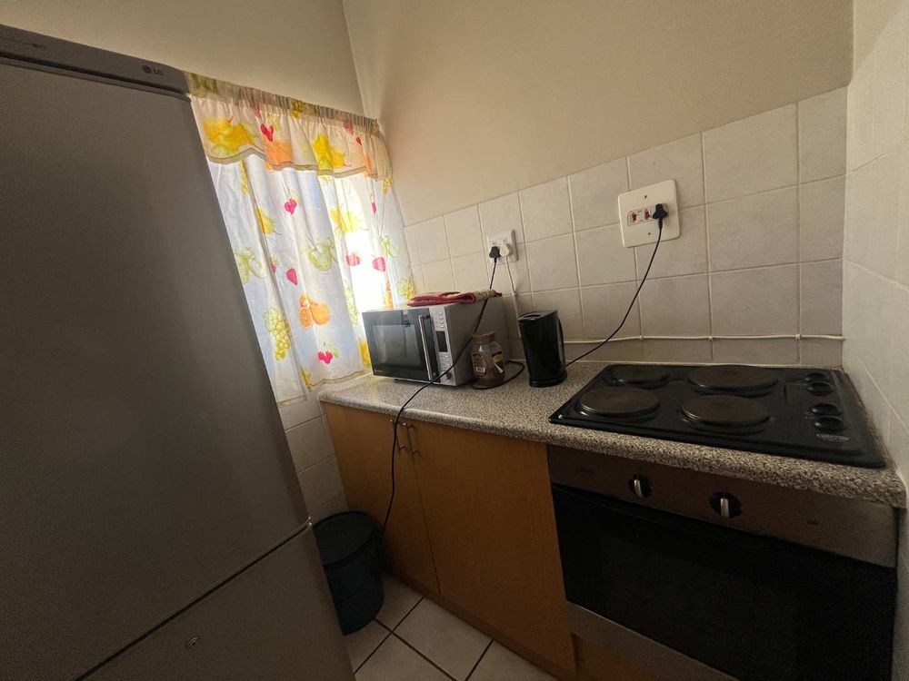 The spacious bedroom has ample and beautiful built-in cupboards and a very neat en-suit bathroom with shower, toilet, and basin. The well-appointed kitchen has also beautiful built-in cupboards with an undercounter oven and electric hob. The living room is spacious and has enough room for your dining table and your television room and features a split unit.