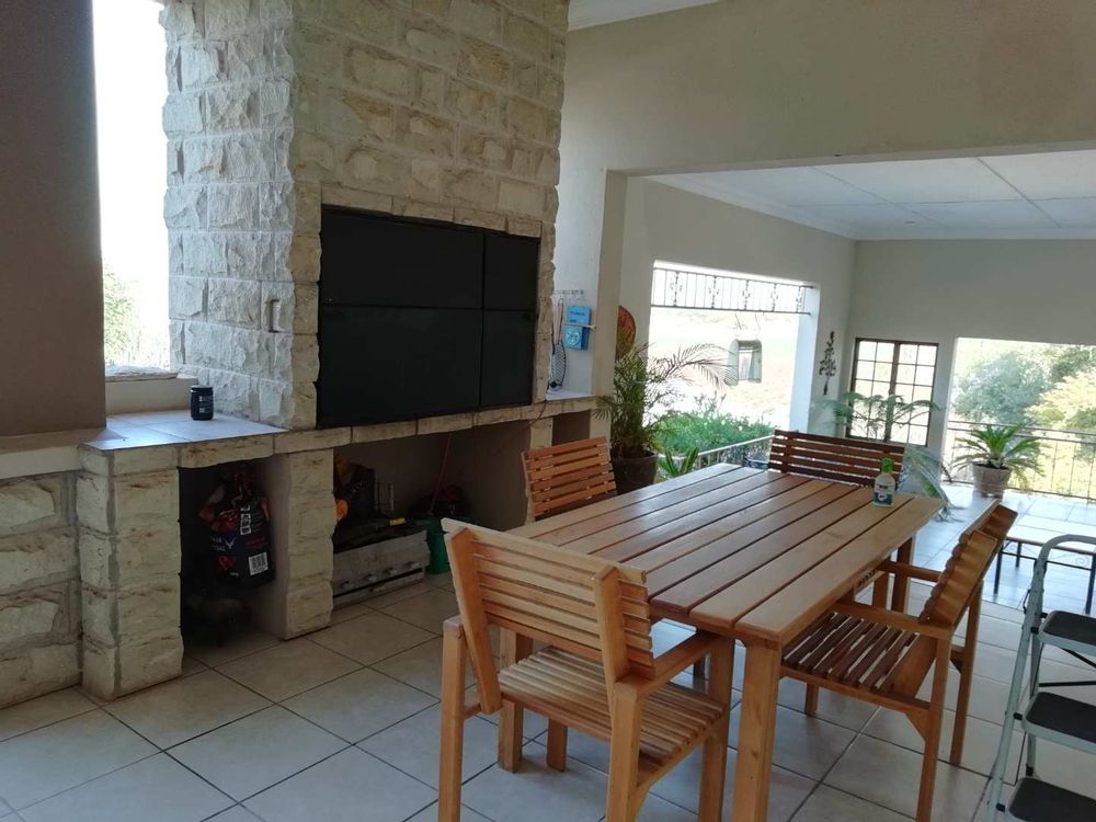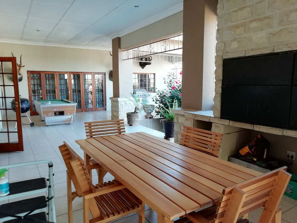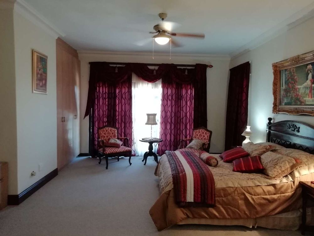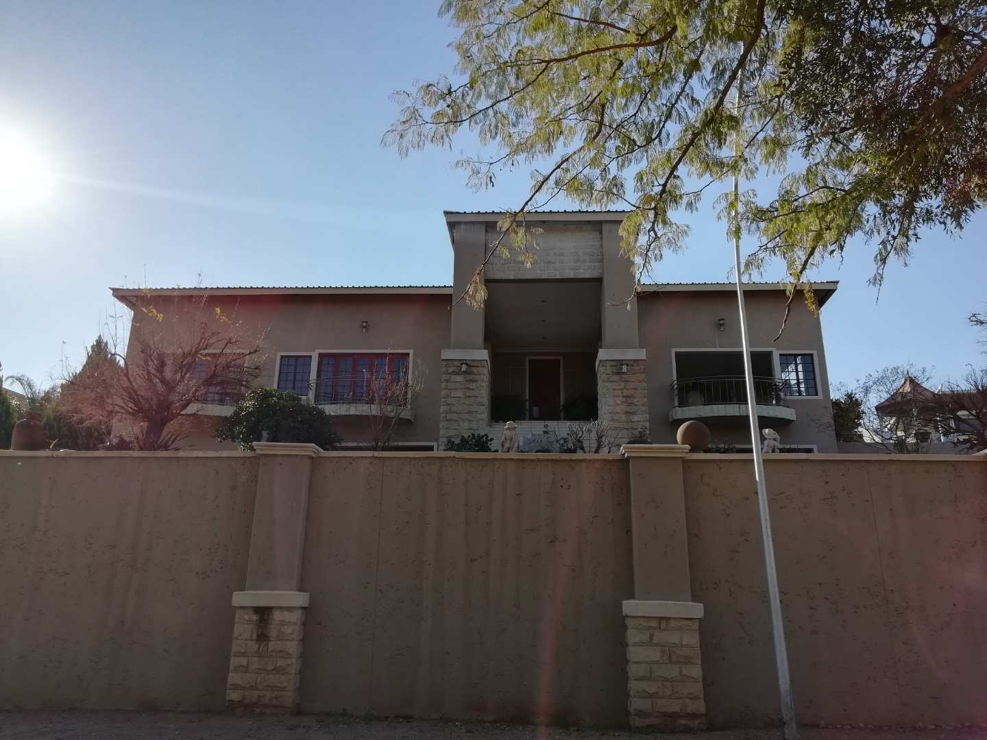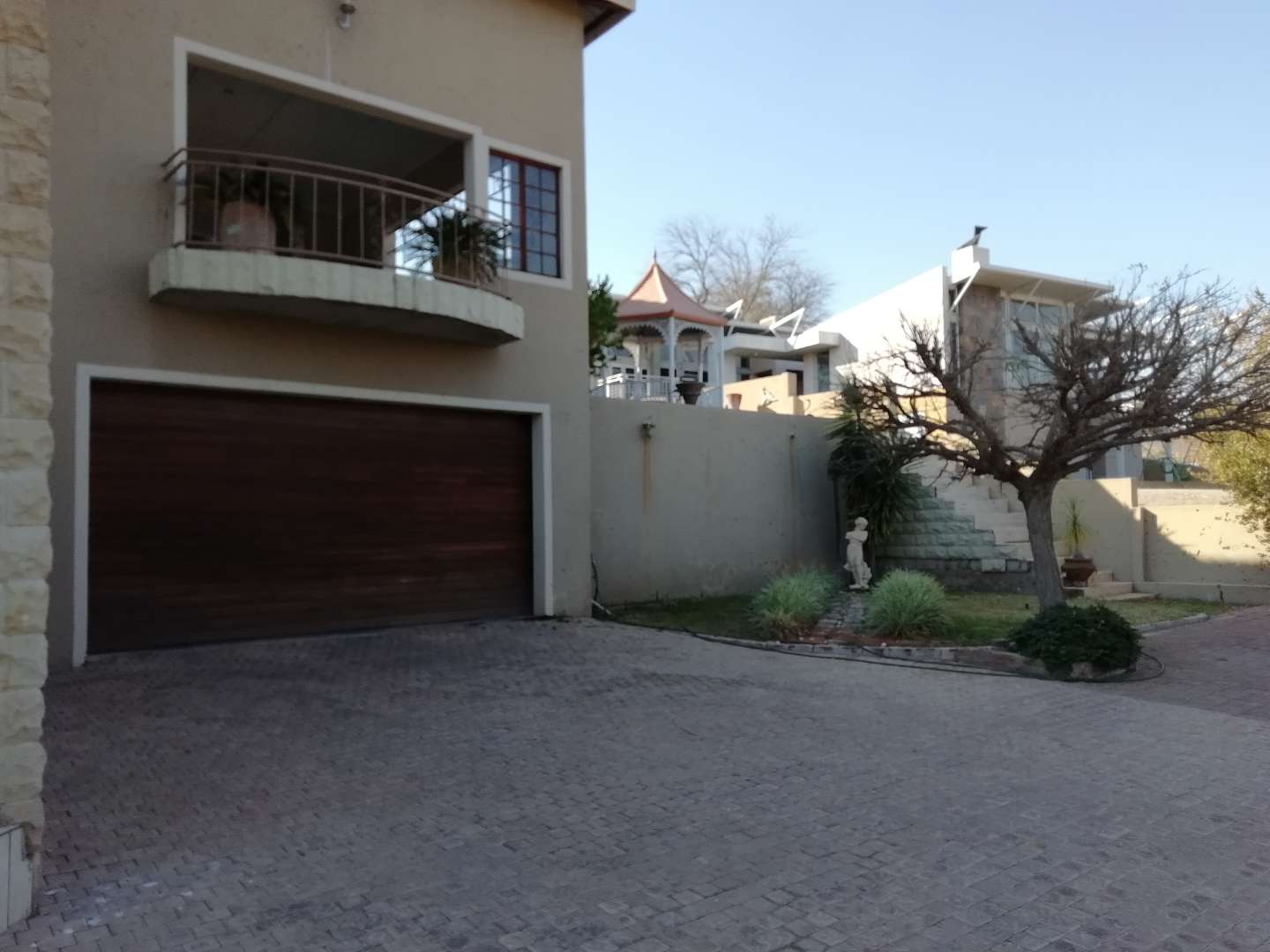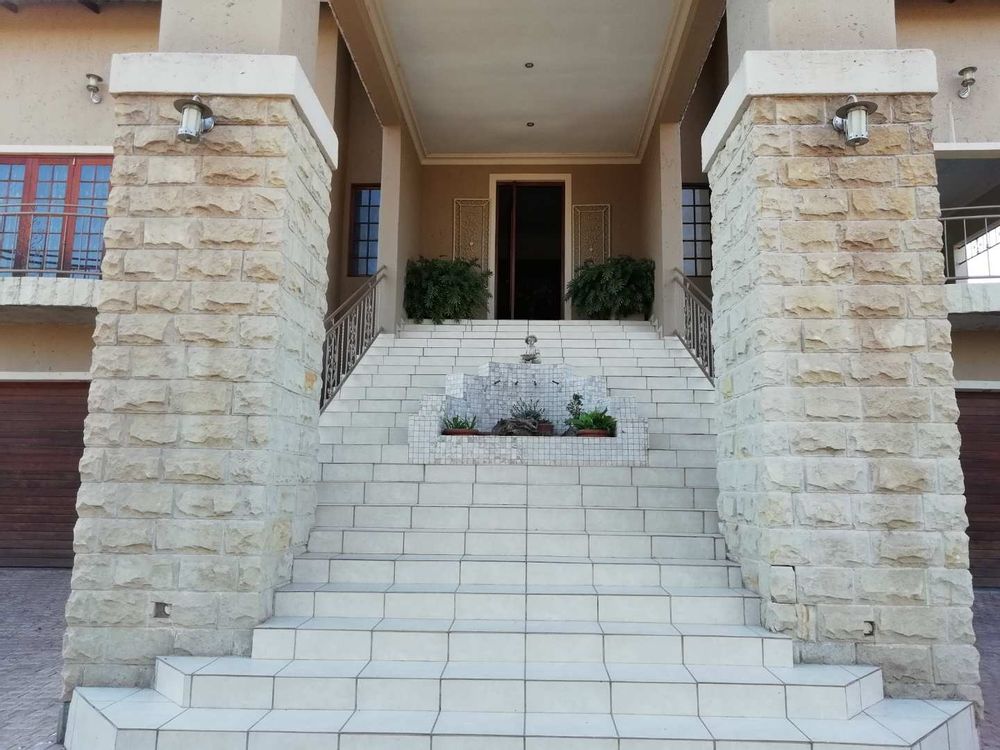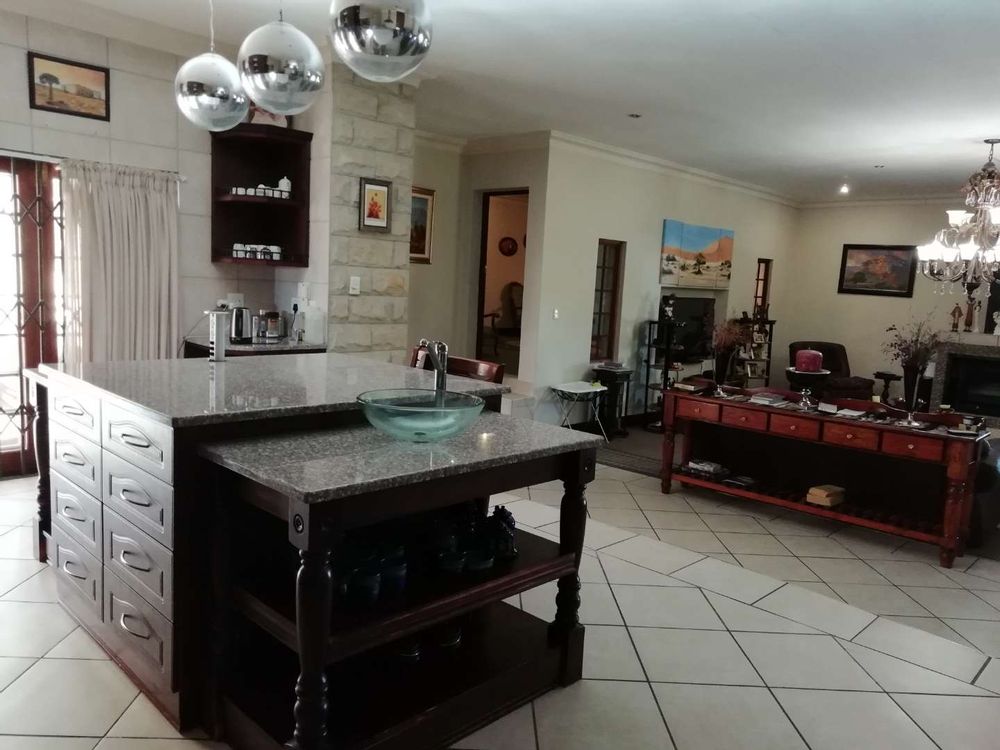 On entering this stunning home, you are welcomed by a double volume entrance hall with a spacious lounge featuring a beautiful crystal chandelier and sliding doors to a balcony with exceptional views. From there you step into very large open plan living areas. Prepare to dine in style in the enormous open plan dining room, family room with cosy fireplace, lovely chandeliers and extra spaces entering to a large stoep outside with built-in braai. These entertainment areas outside with view over the sparkling blue pool will take your breath away. The open plan kitchen has granite tops and gas oven with extractor fan. The separate scullery and laundry provide ample storage space and the spacious pantry has a cellar underneath with a built-in safe.