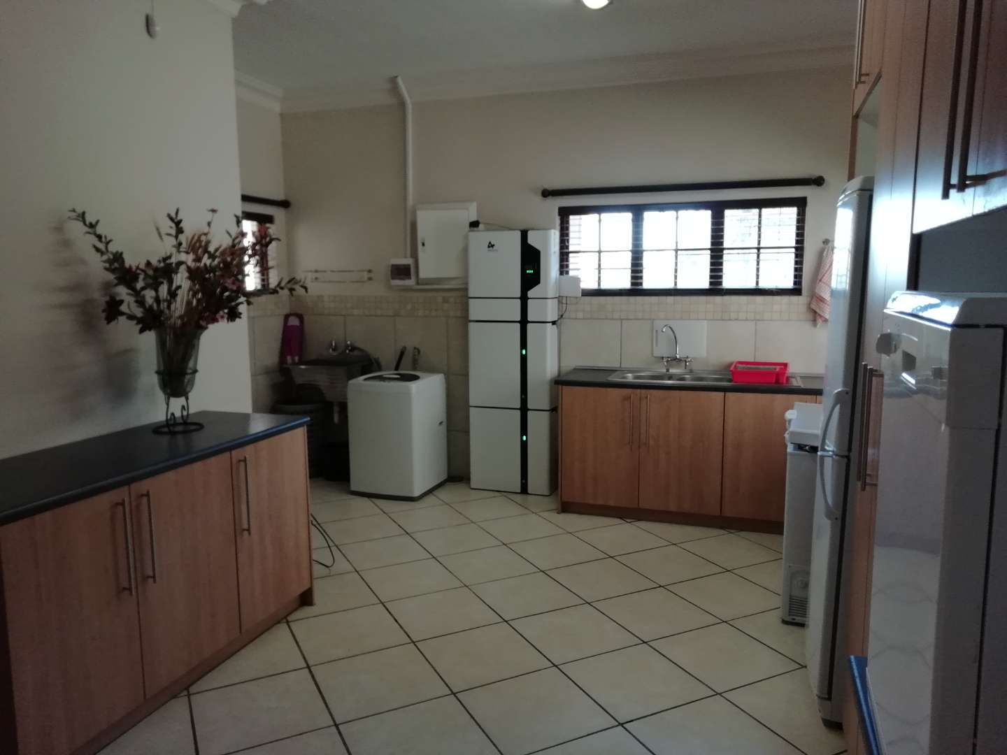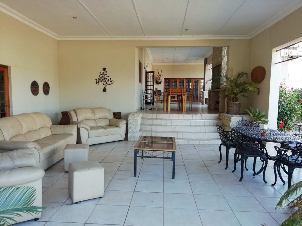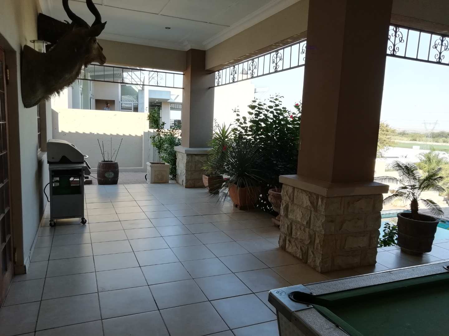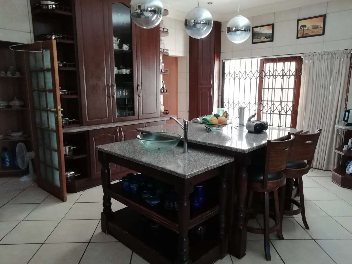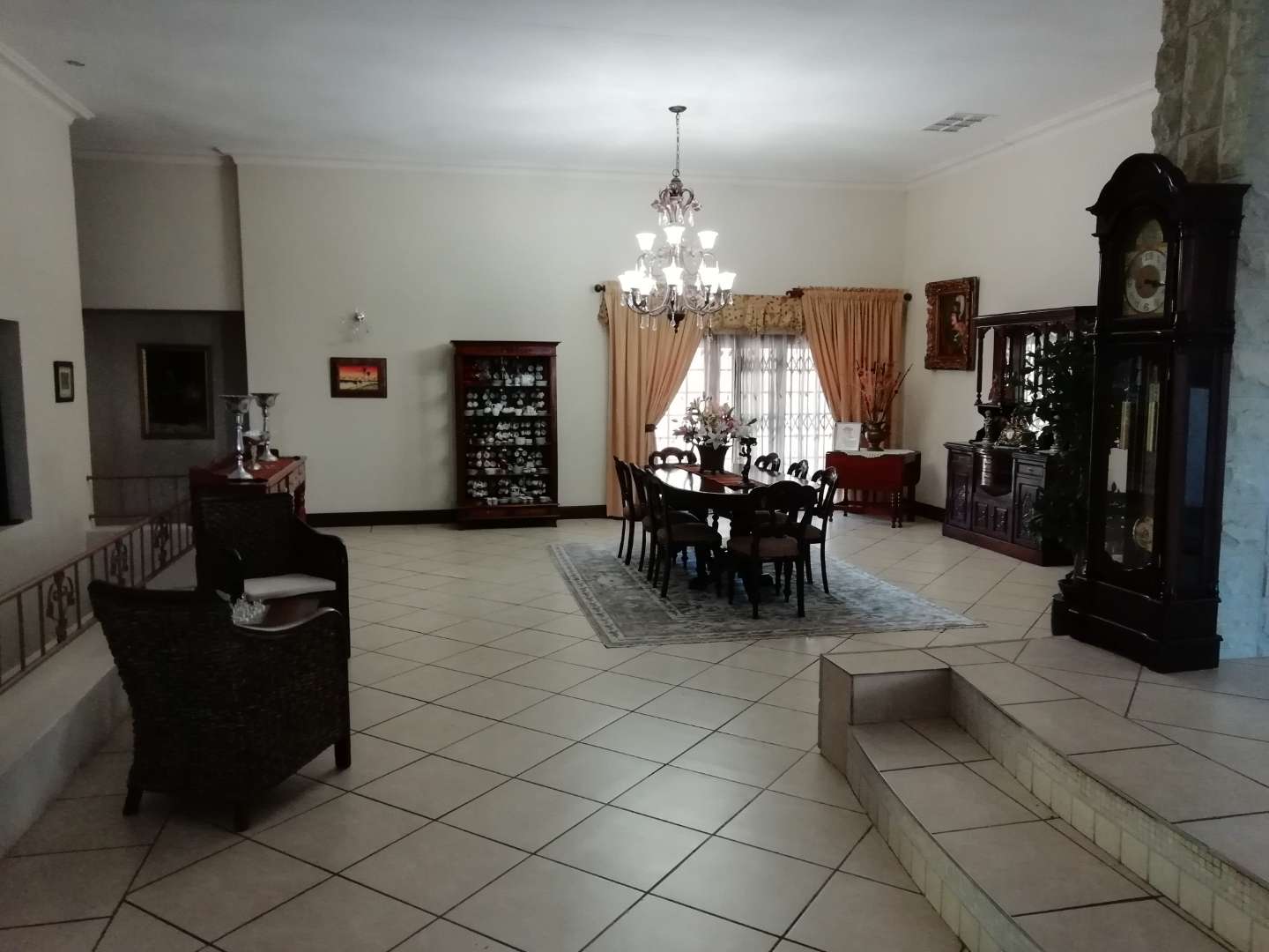 On entering this stunning home, you are welcomed by a double volume entrance hall with a spacious lounge featuring a beautiful crystal chandelier and sliding doors to a balcony with exceptional views. From there you step into very large open plan living areas. Prepare to dine in style in the enormous open plan dining room, family room with cosy fireplace, lovely chandeliers and extra spaces entering to a large stoep outside with built-in braai. These entertainment areas outside with view over the sparkling blue pool will take your breath away. The open plan kitchen has granite tops and gas oven with extractor fan. The separate scullery and laundry provide ample storage space and the spacious pantry has a cellar underneath with a built-in safe.