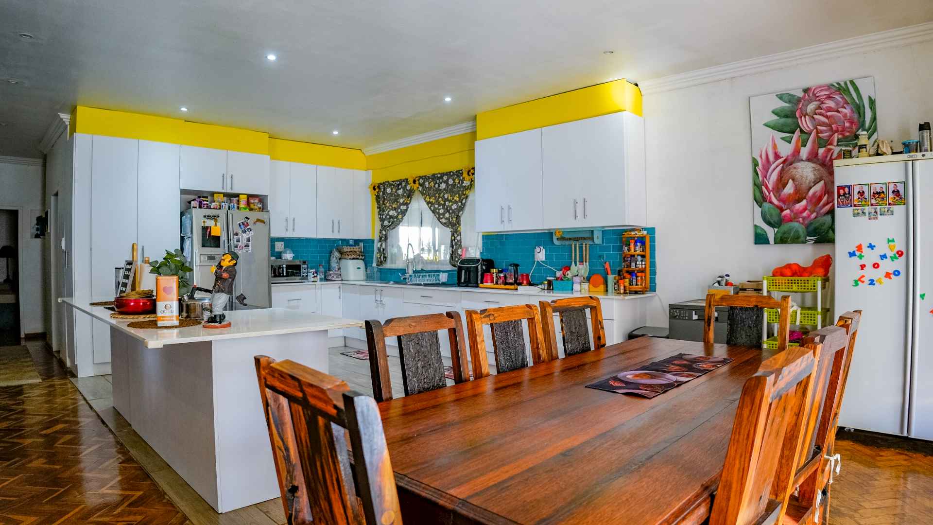 The kitchen offers generous cupboard space, room for a double-door fridge, and practical functionality for everyday living.
