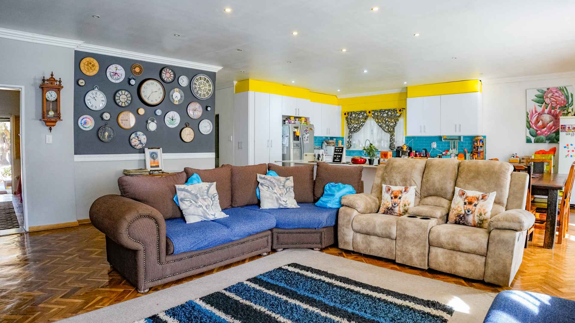 The main home welcomes you with warm character and original parquet flooring flowing through the entrance and living areas. A private first bedroom is positioned just off the entrance, separate from the spacious open-plan living, dining, and kitchen area.