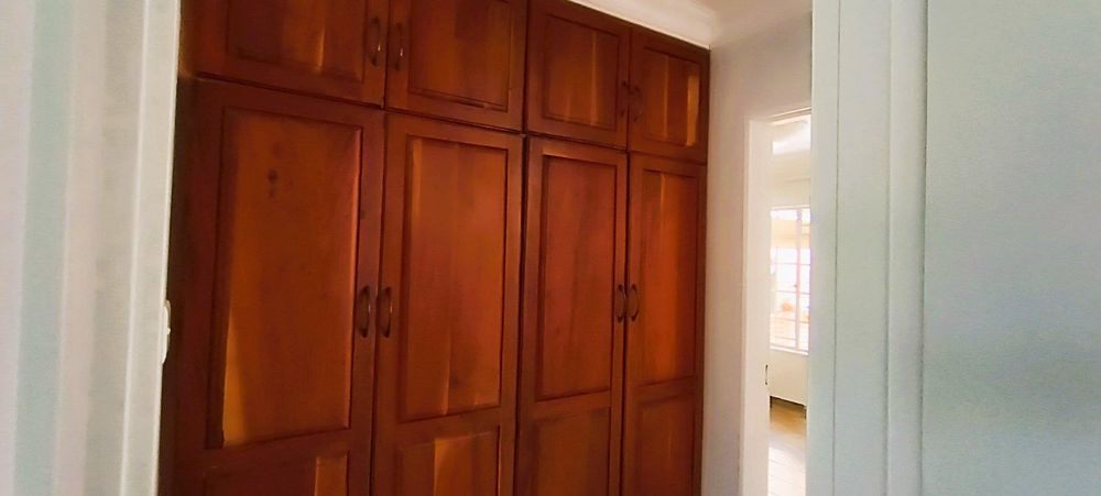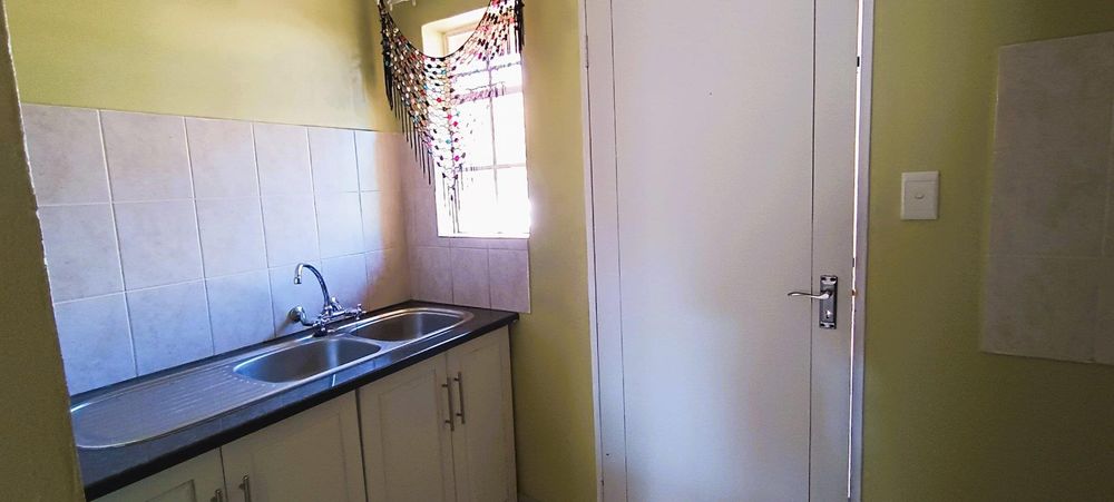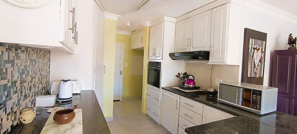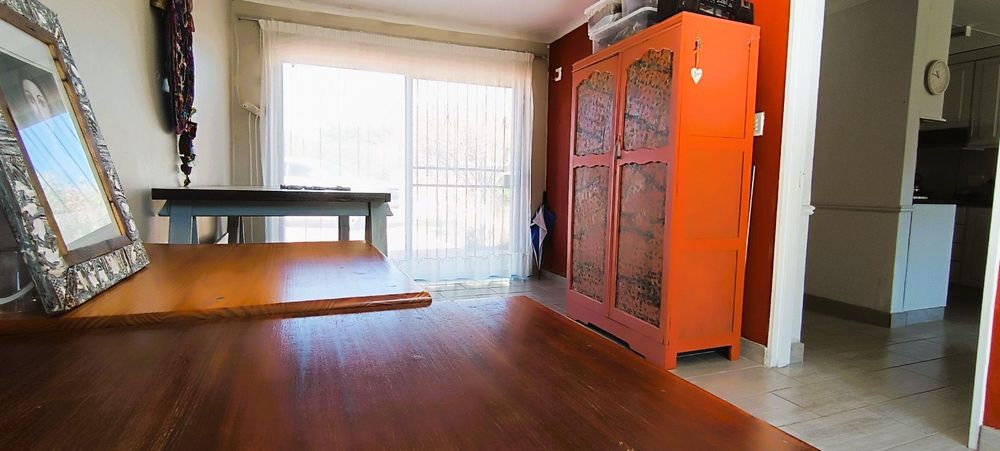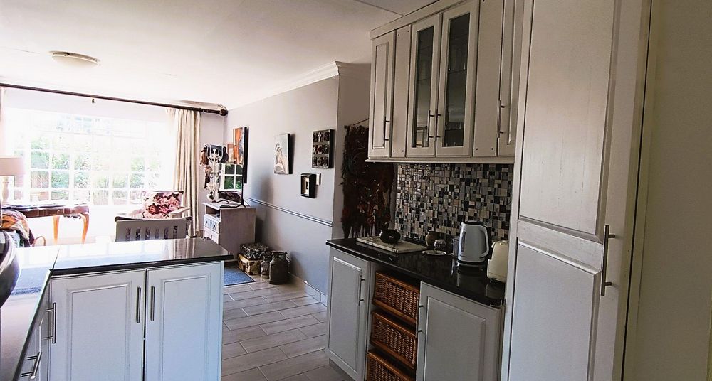 The open-plan layout seamlessly connects the spacious lounge, dining area, and kitchen, ensuring a fluid living space. The kitchen is equipped with beautiful built-in cupboards, a stove with an extractor fan, an eye-level oven, and a separate scullery for added convenience.