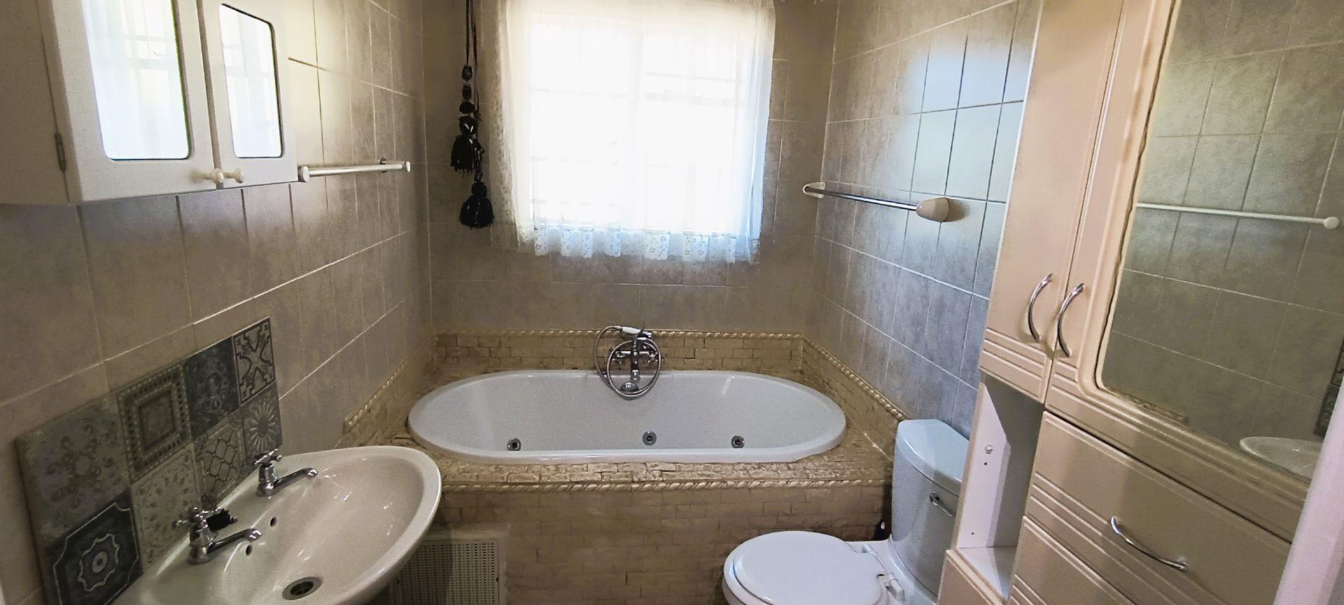 The master bedroom boasts generous proportions, featuring closets that lead to an en-suite bathroom with a luxurious bath and extra cupboard space. Additionally, there's a second bathroom with a shower serving the remaining two bedrooms.