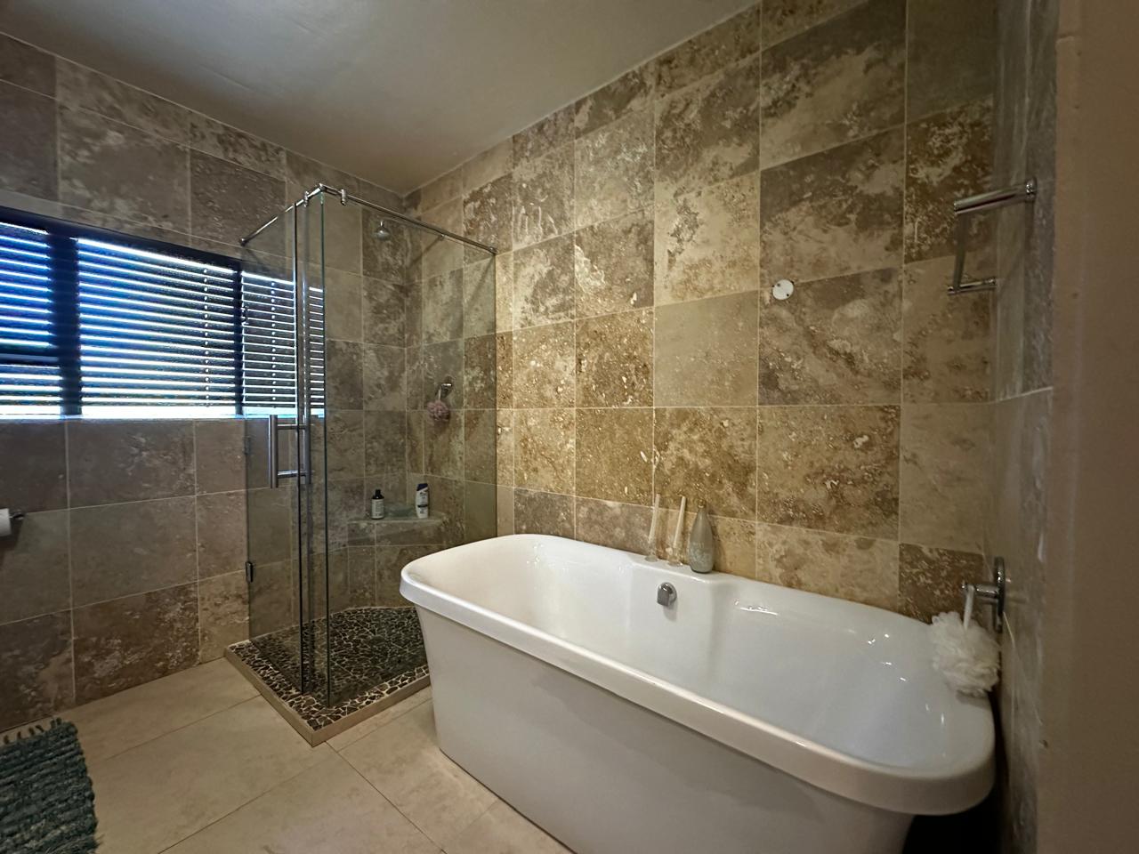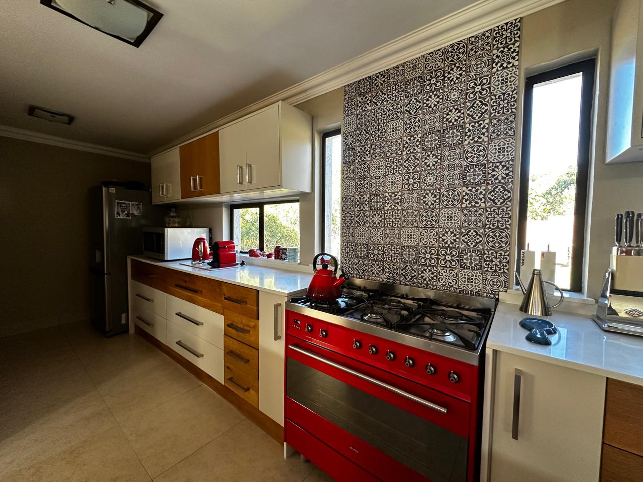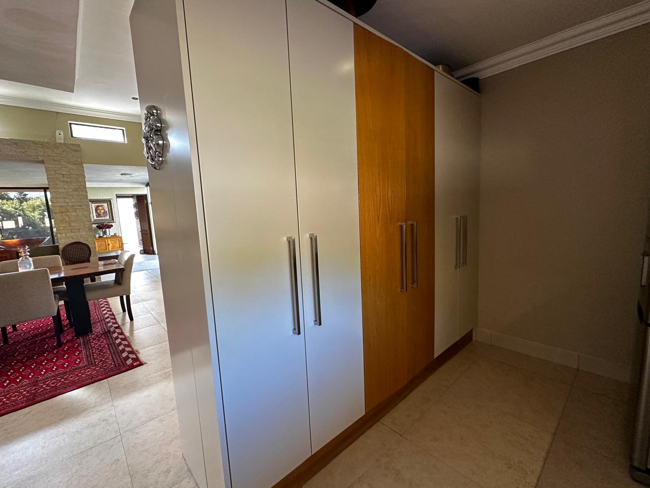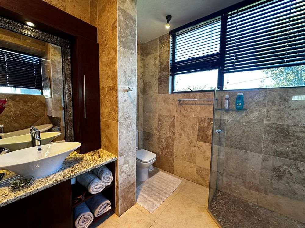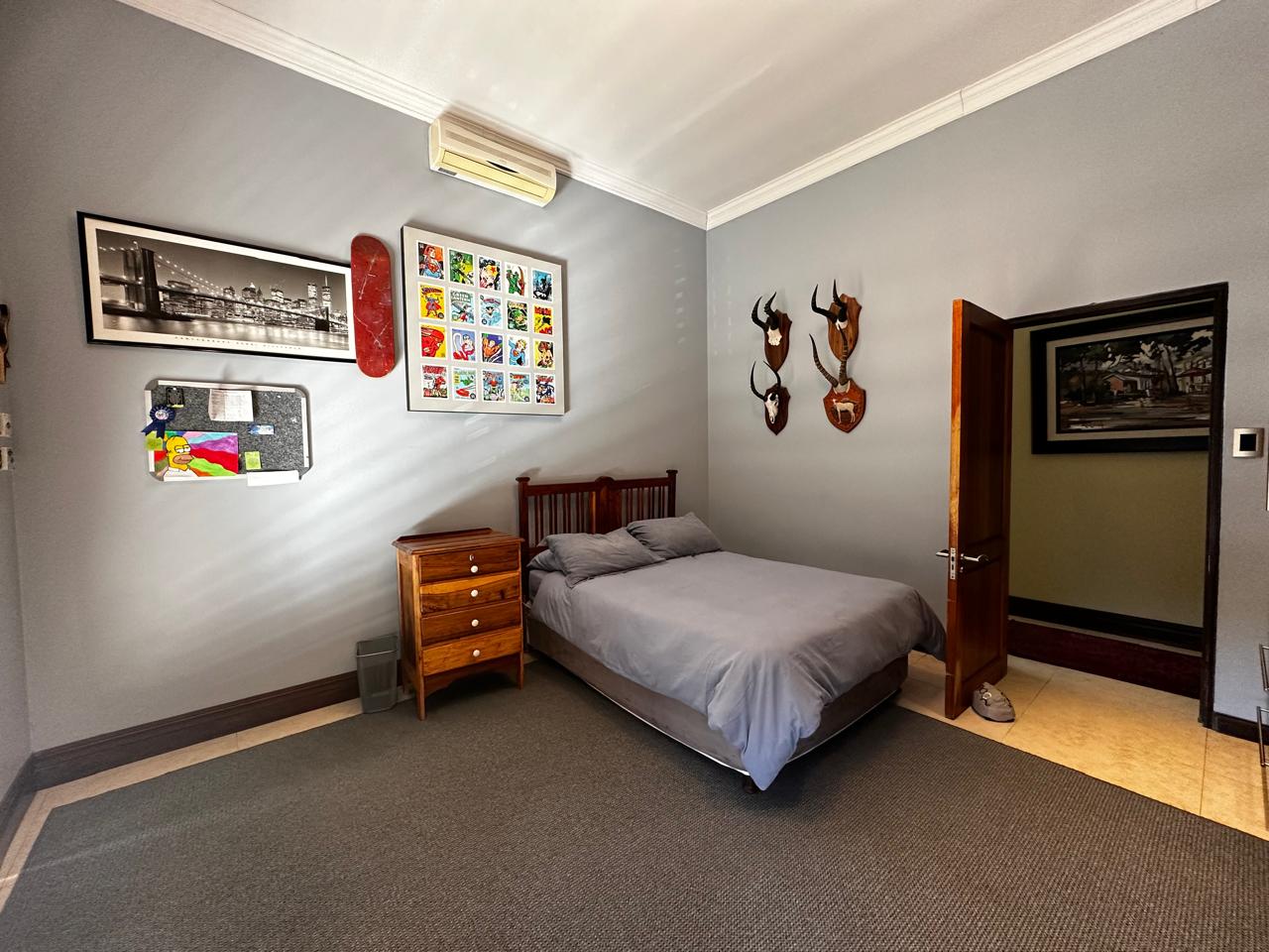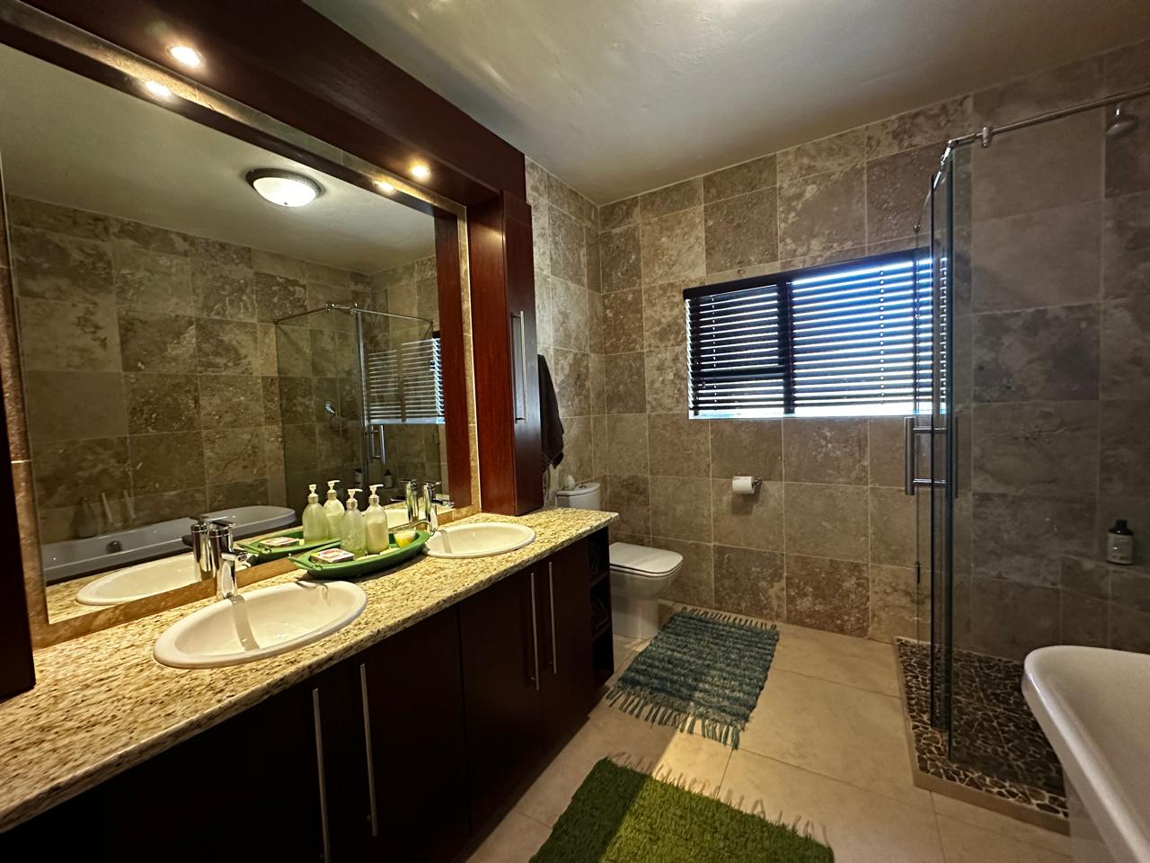 There are four bedrooms on this level, three of which have en-suite bathrooms. The TV room opens onto a lovely stoep with a louver roof, offering views of the pool, braai area, boma, and surrounding greenery.
