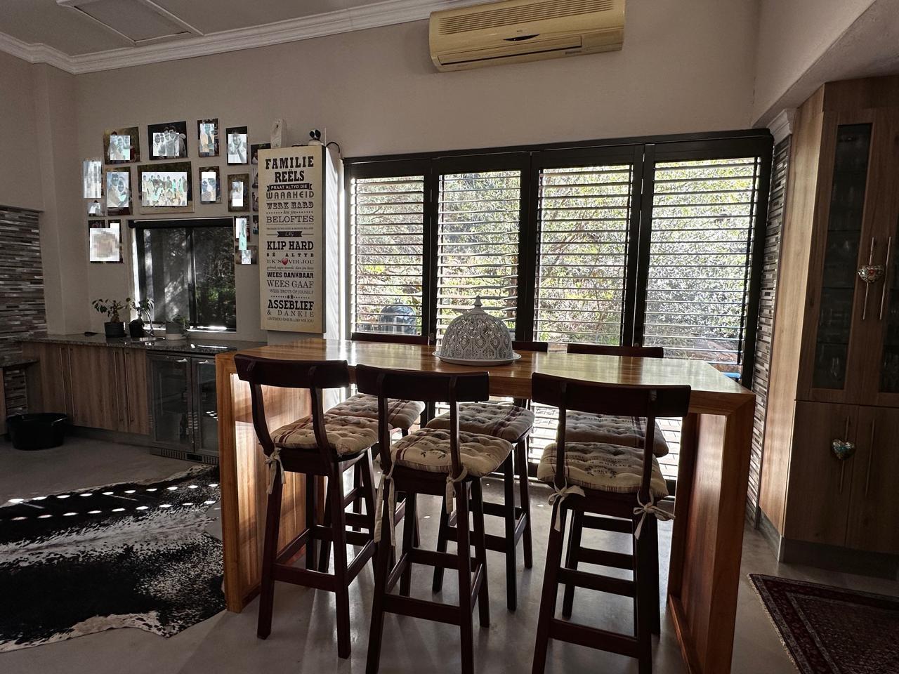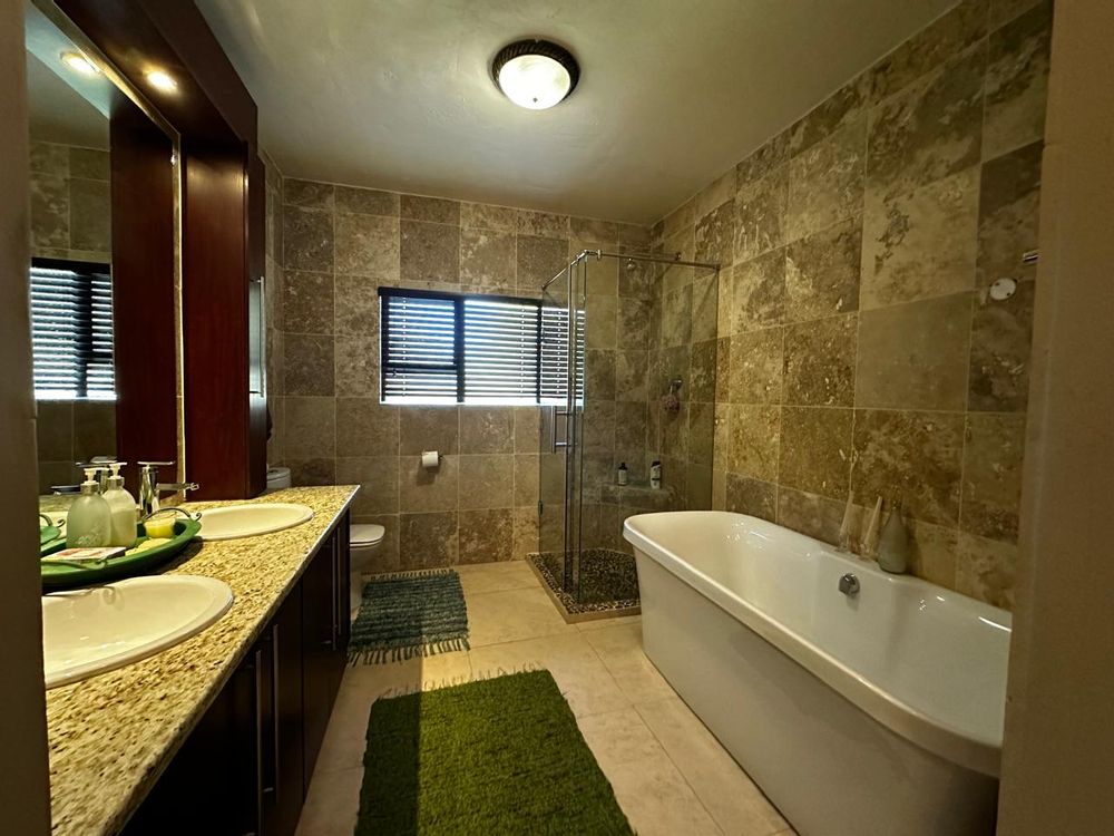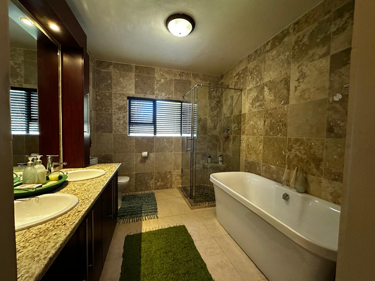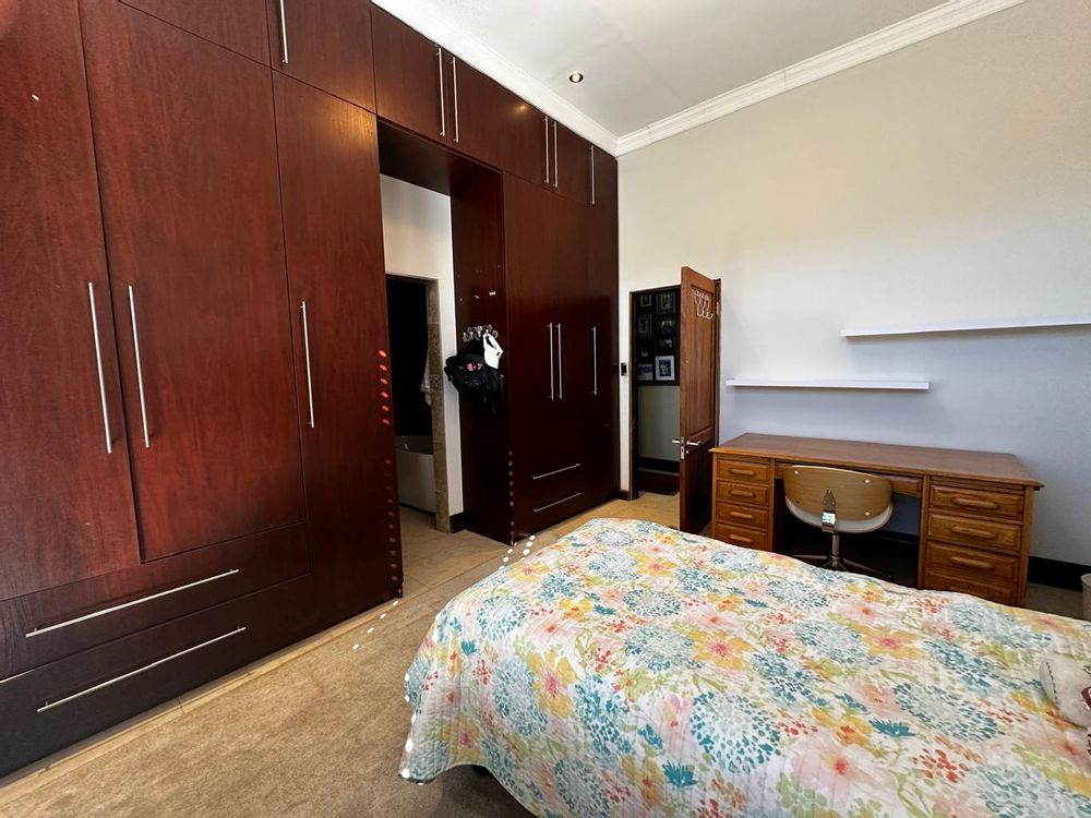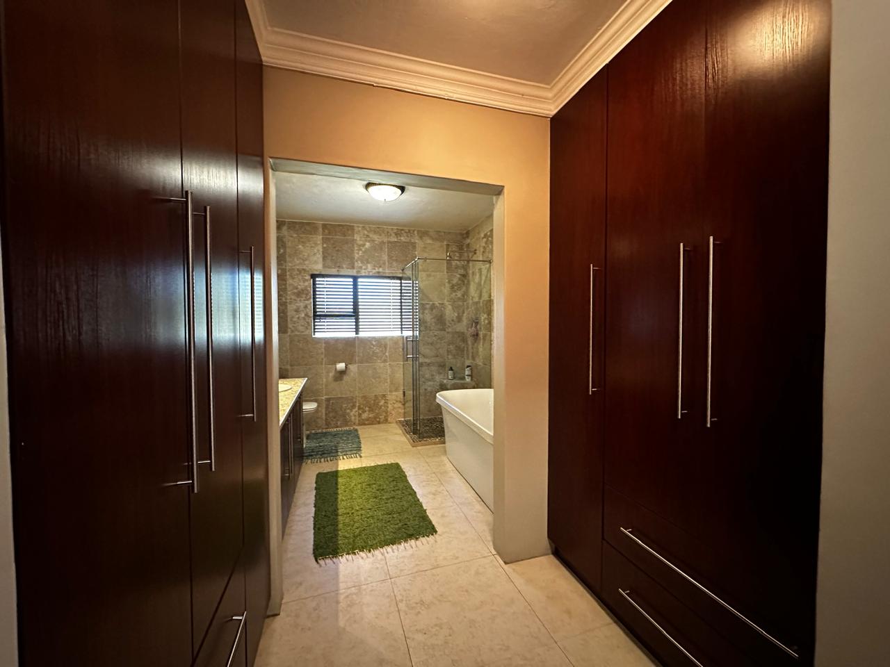 There are four bedrooms on this level, three of which have en-suite bathrooms. The TV room opens onto a lovely stoep with a louver roof, offering views of the pool, braai area, boma, and surrounding greenery.