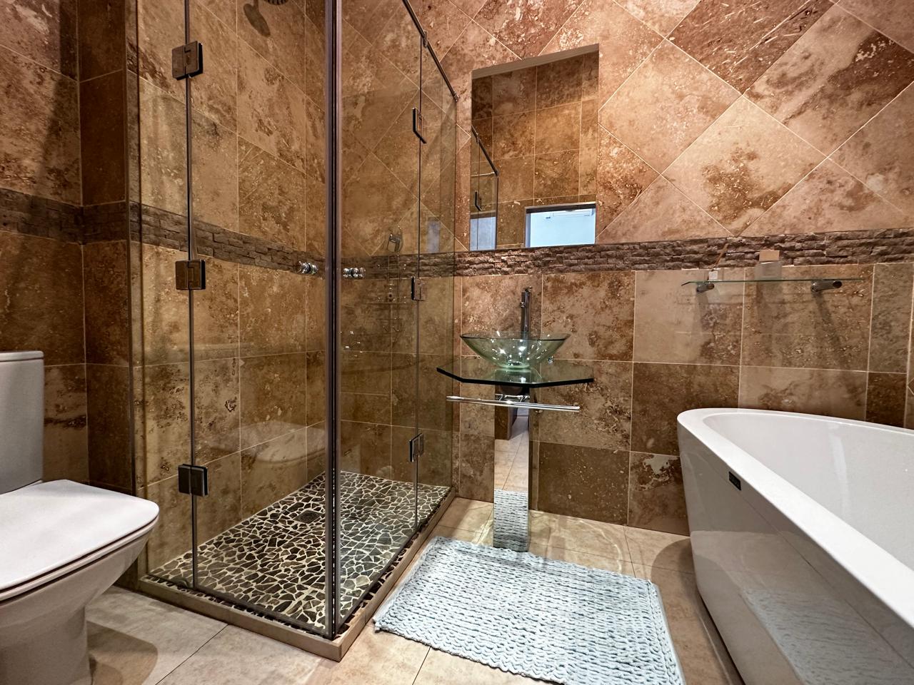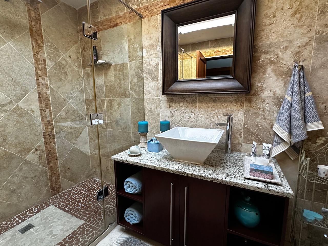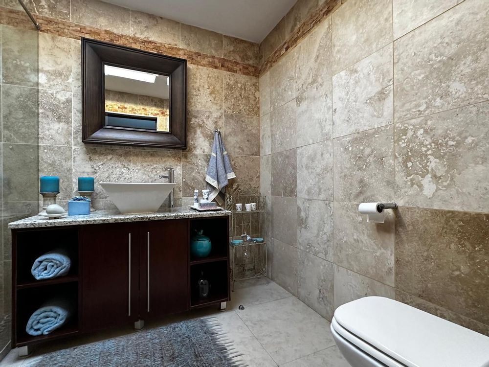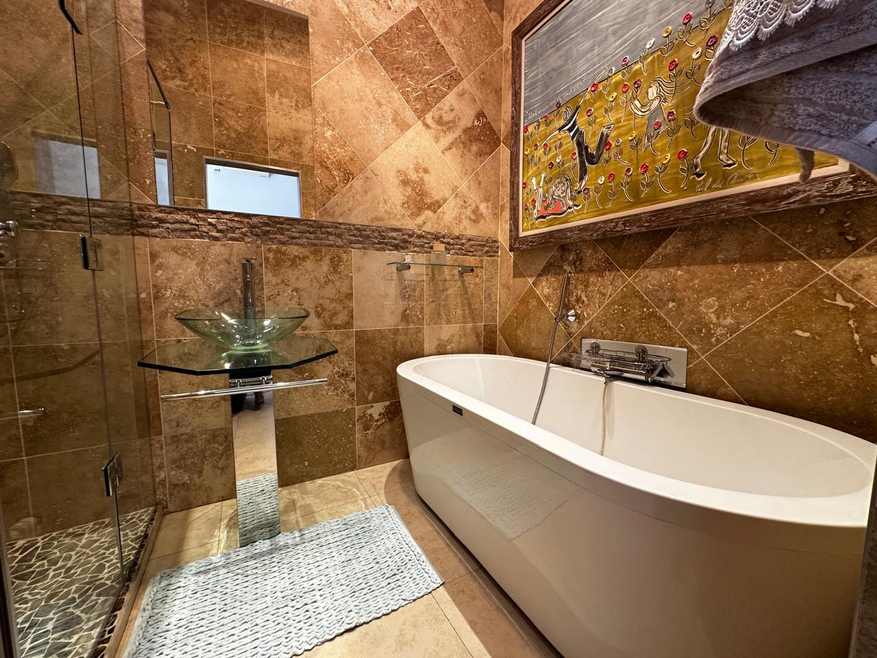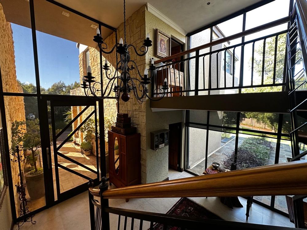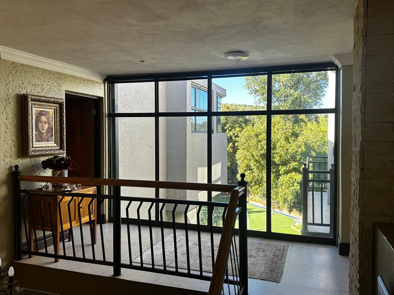 There are four bedrooms on this level, three of which have en-suite bathrooms. The TV room opens onto a lovely stoep with a louver roof, offering views of the pool, braai area, boma, and surrounding greenery.