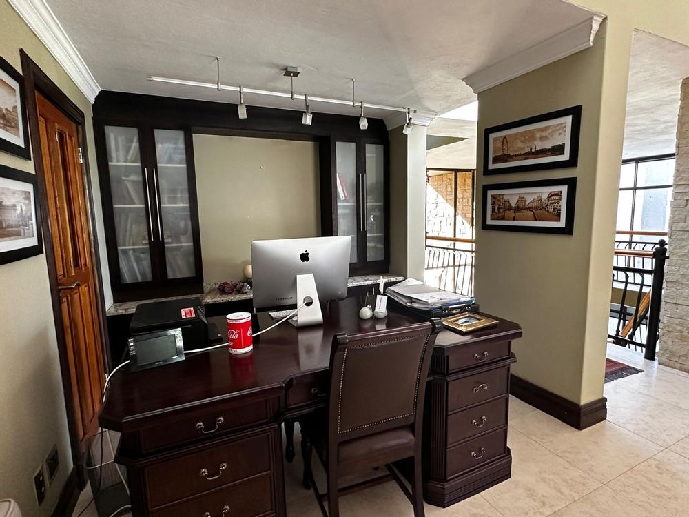 Upstairs, you will find a spacious open plan layout with a lounge, dining room with a fireplace, kitchen, family room, braai area, and office space. The modern kitchen boasts pristine white granite countertops, a separate scullery, and a laundry room. Throughout the house, you will find elegant chandeliers adding to the opulence.