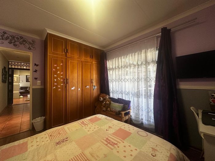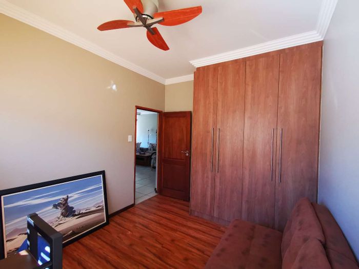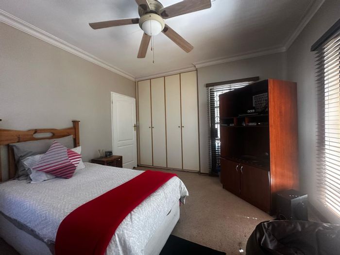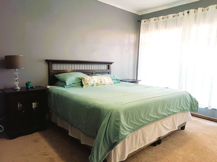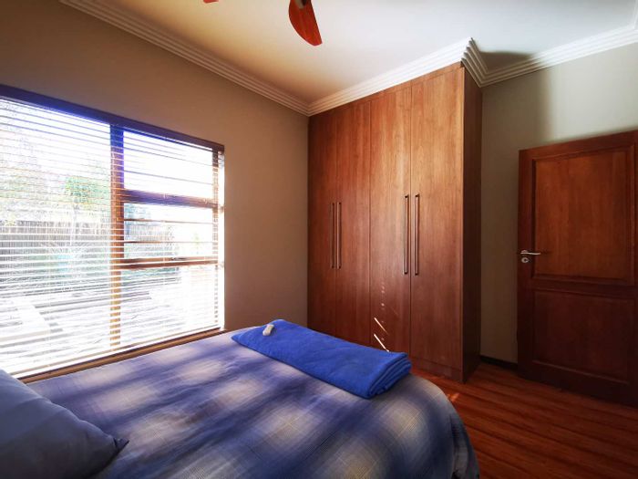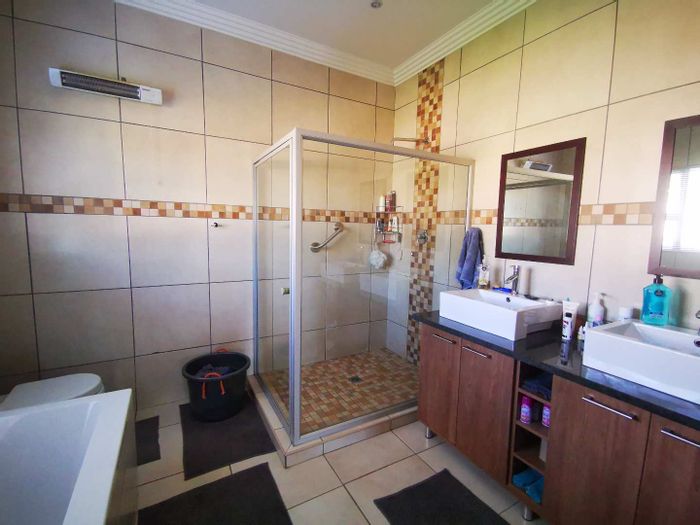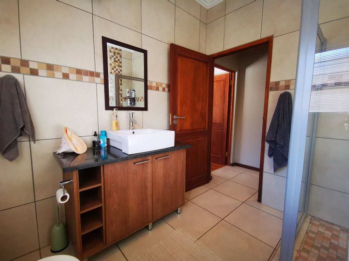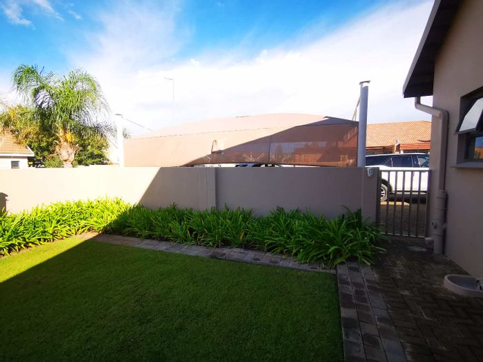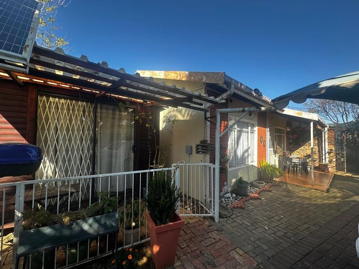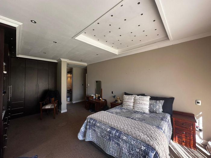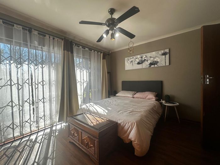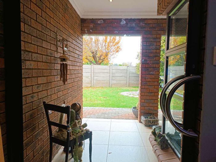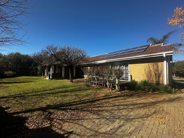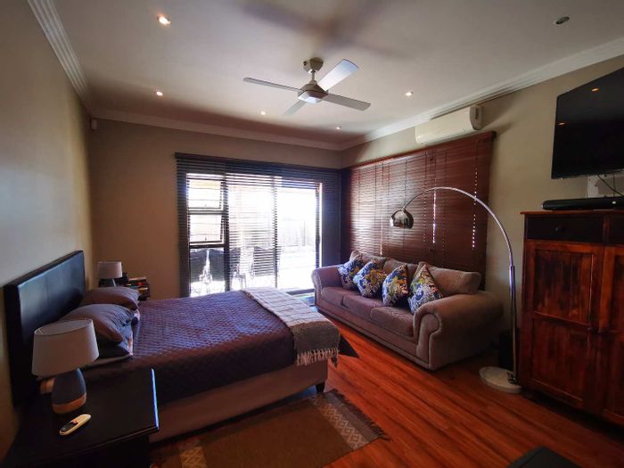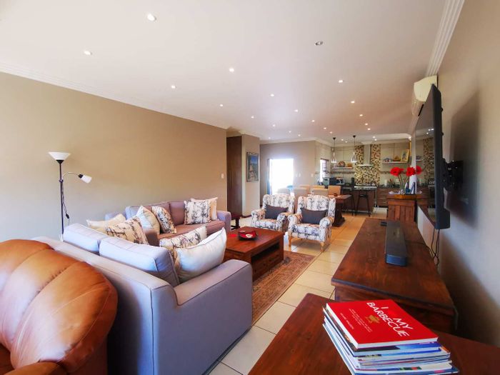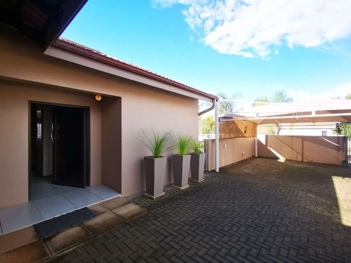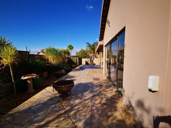 Solar-powered luxury in Bloemfontein — open-plan living with gourmet kitchen and enclosed braai, pool and low-maintenance garden, plus master suite with walk-in closet and spa bath. 3-bed, 2-bath, double garage.