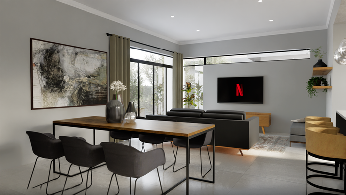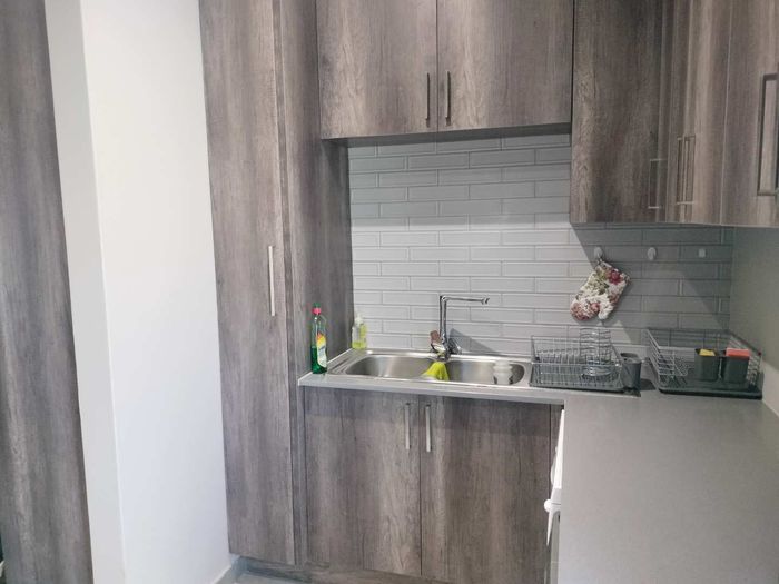 First-floor property with open plan kitchen, two bedrooms with built-in cupboards, balcony, carport, communal pool, and prepaid electricity/water. Ideal for students or young professionals.