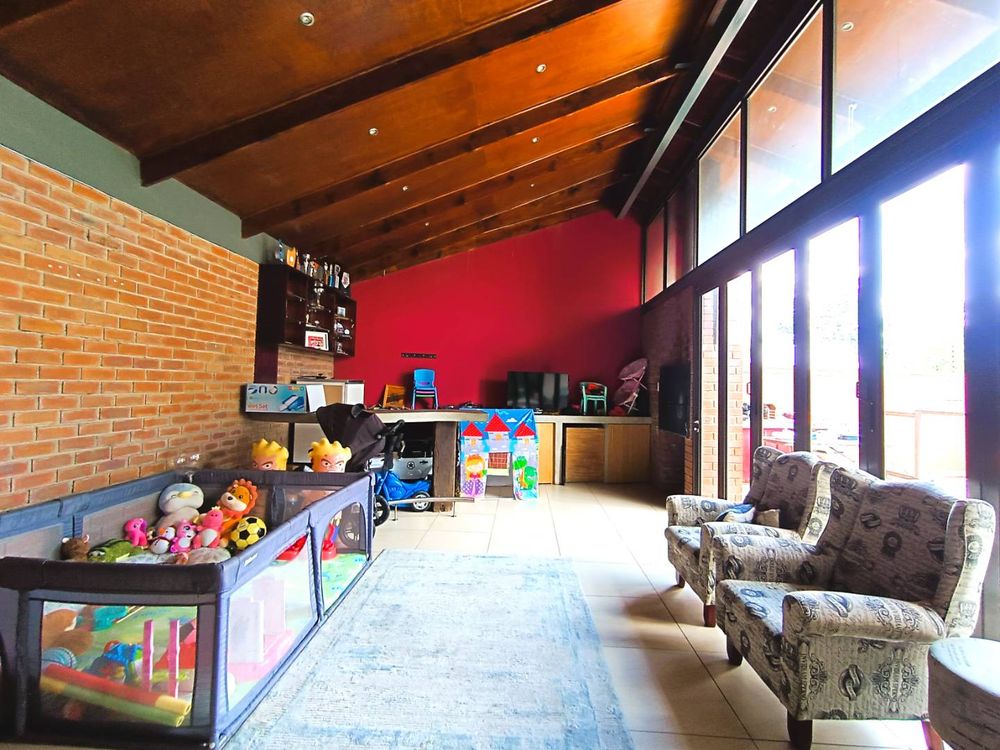 An indoor entertainment area with a built-in braai and stacking doors opens onto the garden and splash pool, creating an effortless indoor-outdoor lifestyle. The braai cleverly serves both the interior and exterior spaces, making it ideal for year-round entertaining, whether indoors on cooler evenings or outdoors beside the pool in summer.