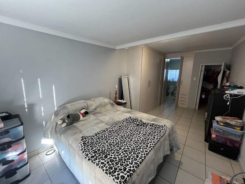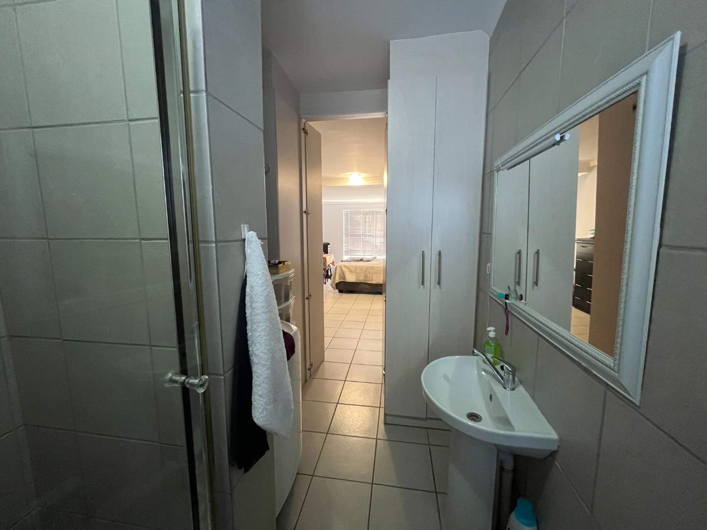 The spacious bedroom includes ample built-in cupboards and a sleek en-suite bathroom fitted with a shower, basin, and toilet, all finished in a modern and stylish design.