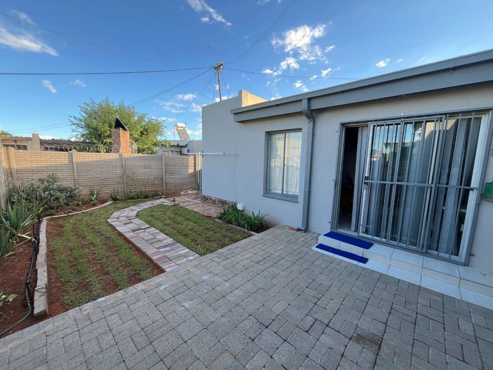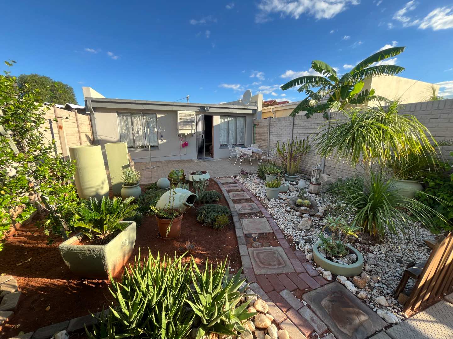 At the back, you’ll find a private, paved patio area overlooking a well-kept garden with irrigation—perfect for relaxing or entertaining. Additional features include a solar system, offering energy efficiency and cost savings.