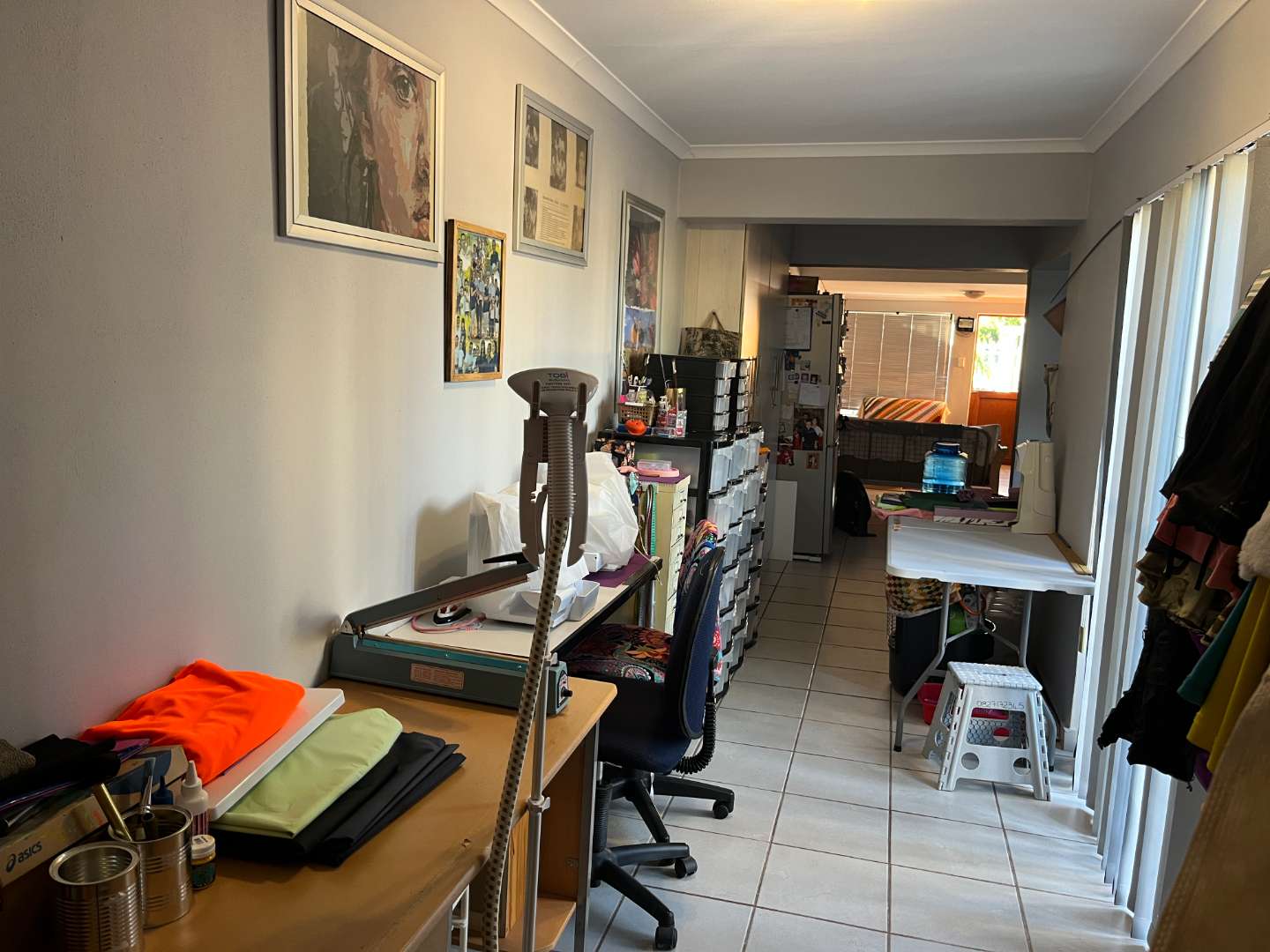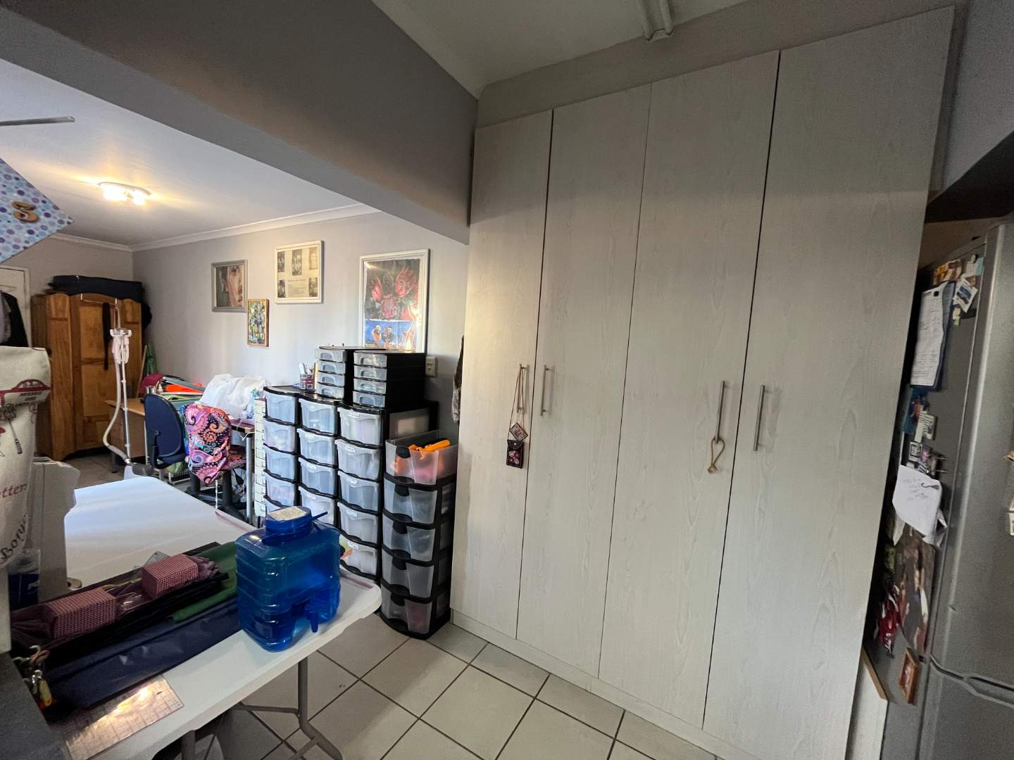 Step inside to a generous open-plan living area and modern kitchen, featuring an undercounter oven, electric hob, and ample built-in cupboards. An added bonus is the extra room adjoining the living space—ideal for use as a home office, hobby room, or extra bedroom. A separate storeroom with shelving provides valuable additional storage.