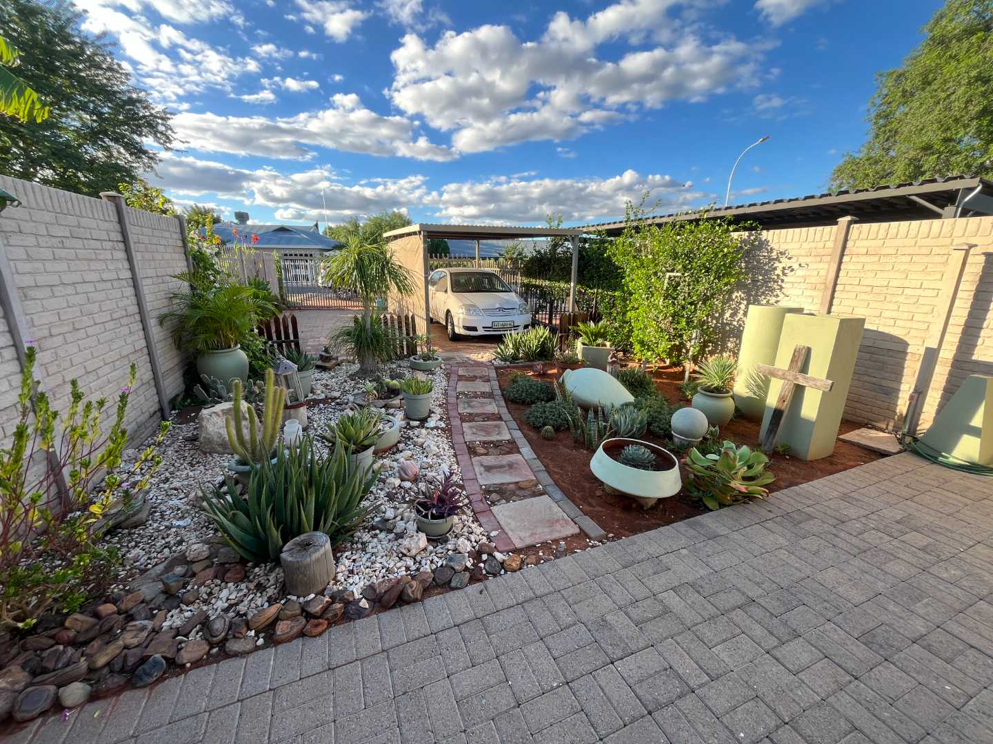 The property boasts a well-maintained and landscaped front garden, creating a welcoming first impression. Secure parking is provided by a single carport with an electric motor gate, as well as a second entrance gate offering additional parking. Neat paving adds to the overall tidy and low-maintenance appeal.