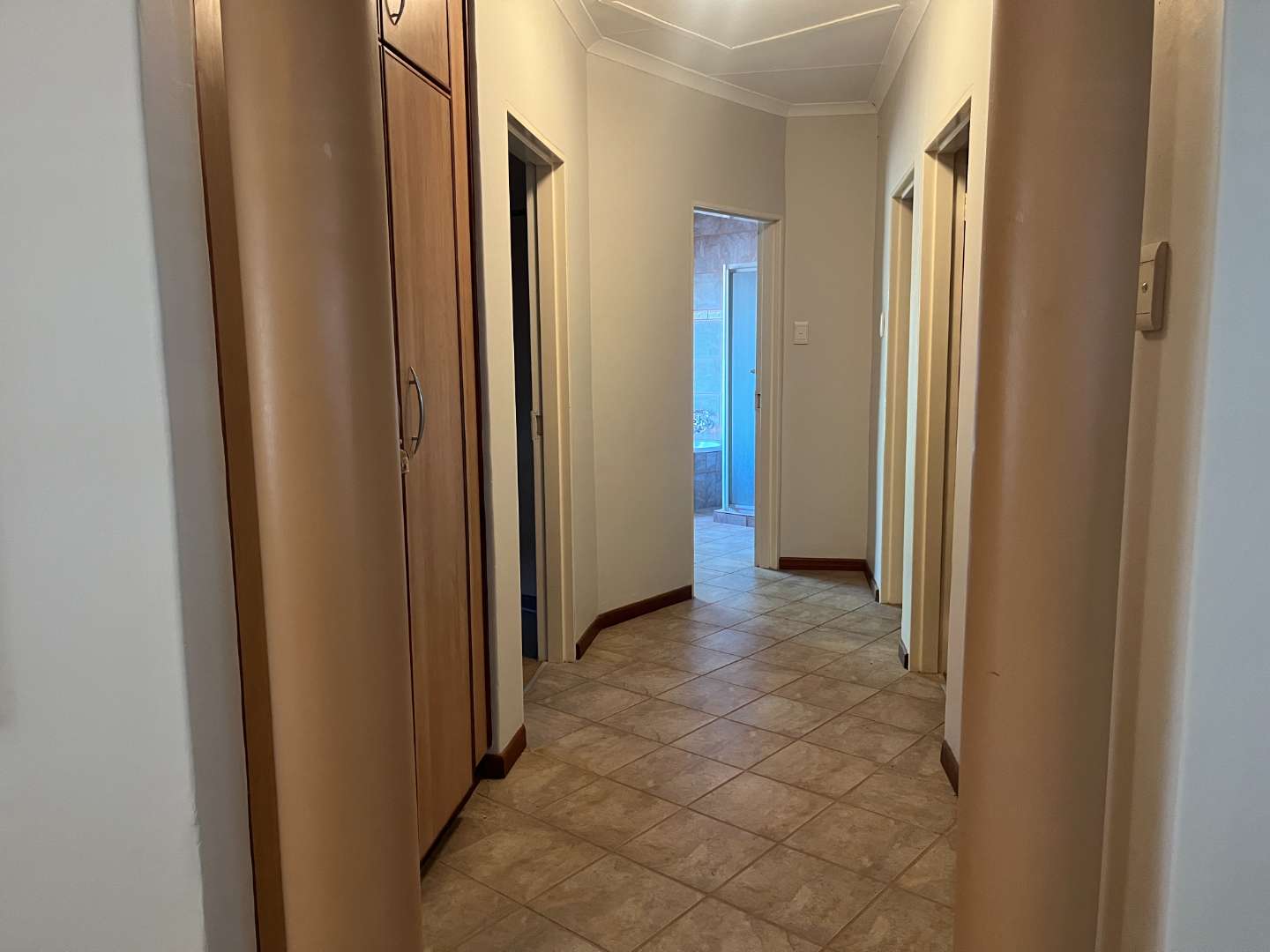 The home features three spacious bedrooms, all fitted with built-in cupboards. The main bedroom is generously sized and includes ample cupboard space and a full, modern en-suite bathroom. A second full modern bathroom services the remaining bedrooms. Additional built-in cupboards in the hallway provide excellent extra storage, while a central water cooler ensures comfort throughout the home.