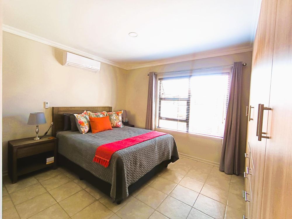 Inside, the home is neatly tiled throughout, giving it a clean and modern feel. The open-plan lounge and dining area, complete with air conditioning, flows seamlessly into a beautifully designed kitchen. With ample built-in cupboards, a stove with under-counter oven, space for all your appliances, and a separate scullery, this kitchen is both practical and stylish.