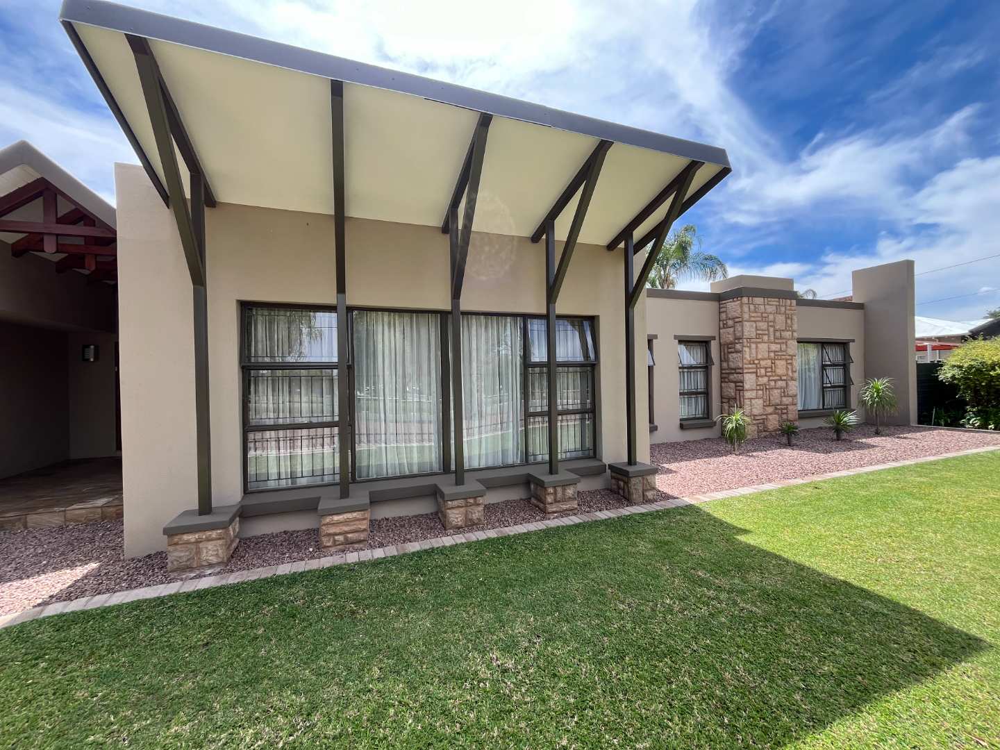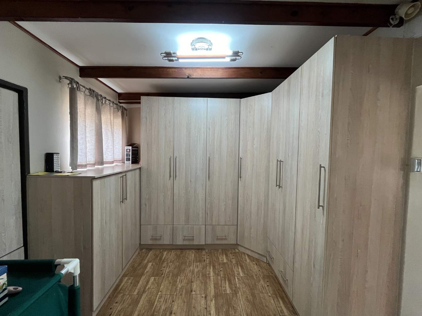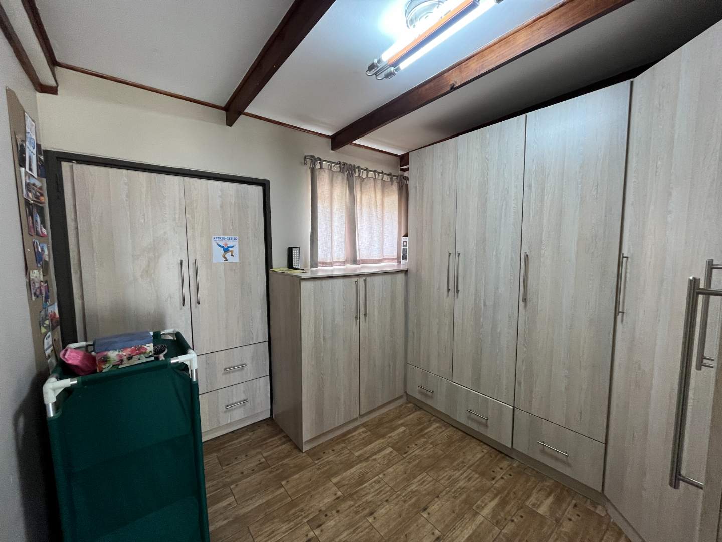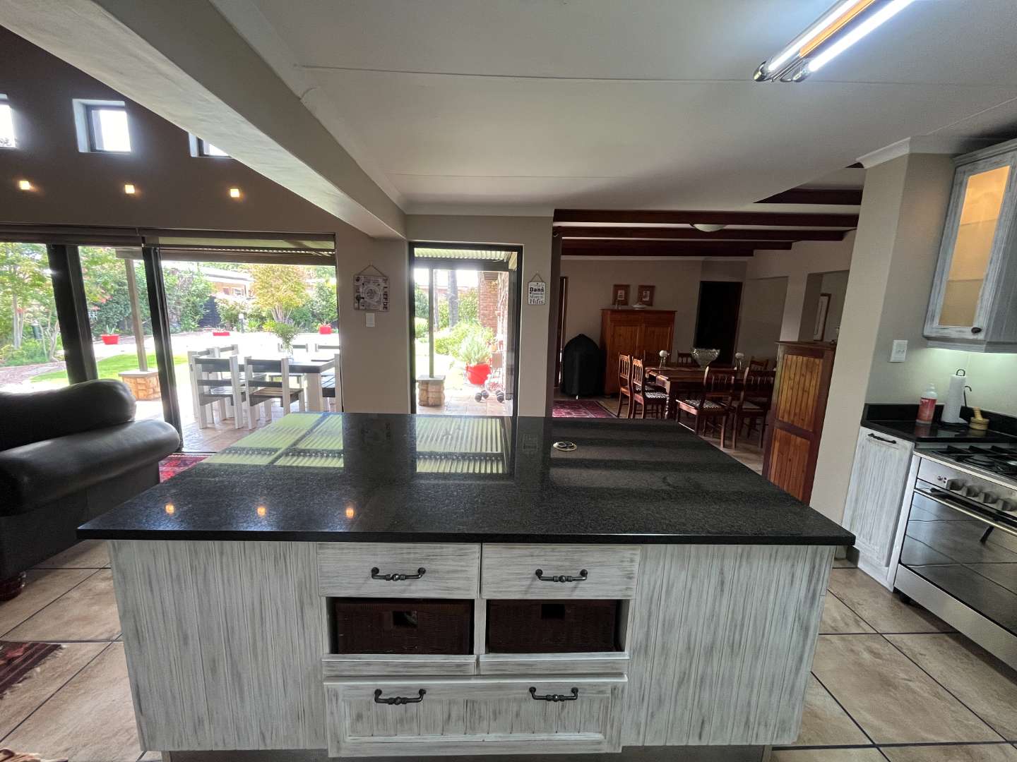 At the heart of the home lies a stylish modern kitchen, featuring sleek granite countertops, beautifully crafted cabinetry, a gas stove with extractor fan, and a central island ideal for gatherings and casual dining. A generous separate scullery and laundry with built-in cupboards offers space for a dishwasher, washing machine, and tumble dryer, while additional space can easily accommodate a pantry or private home office.