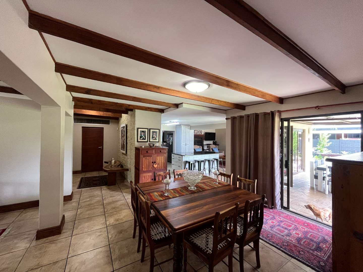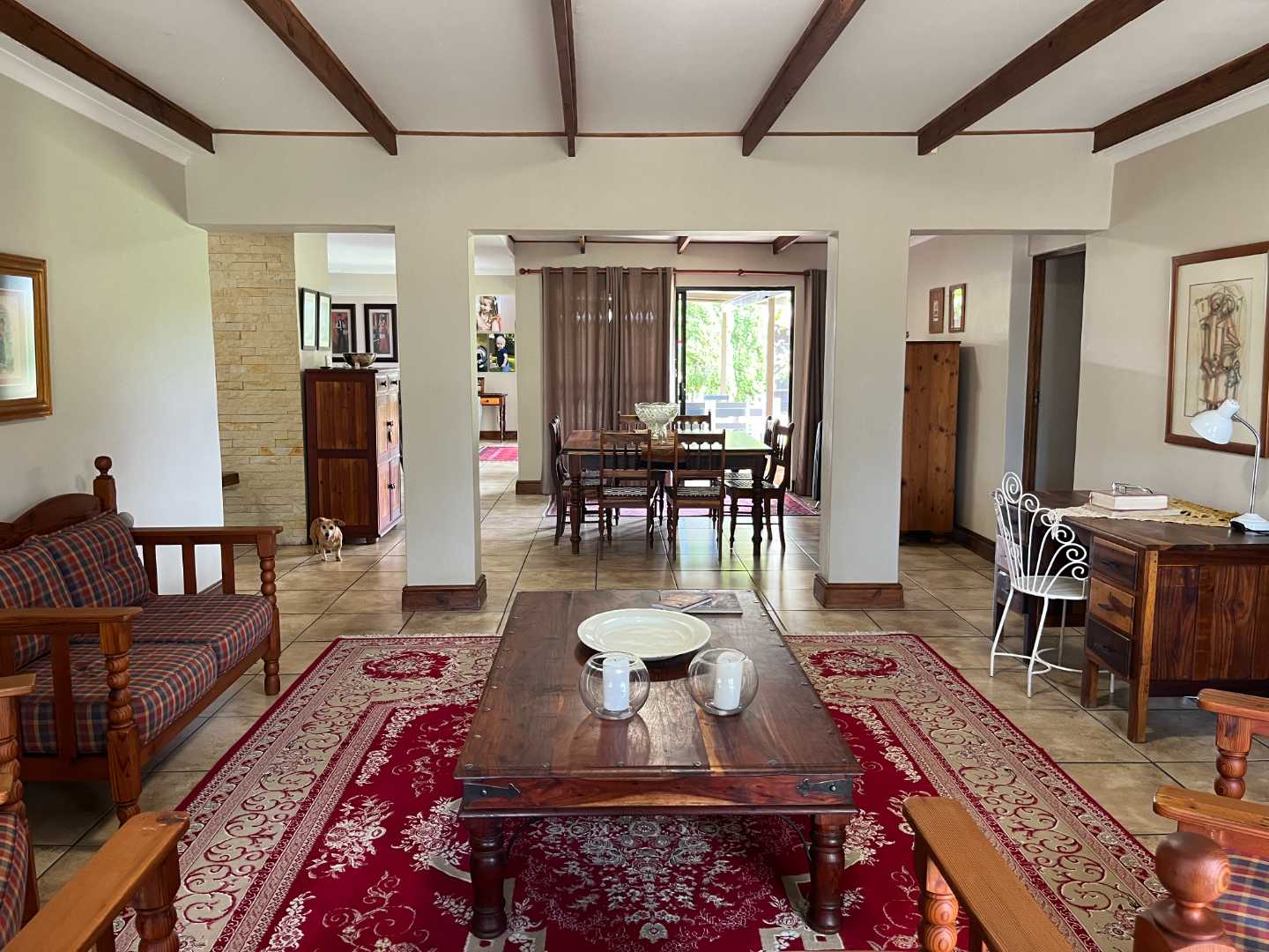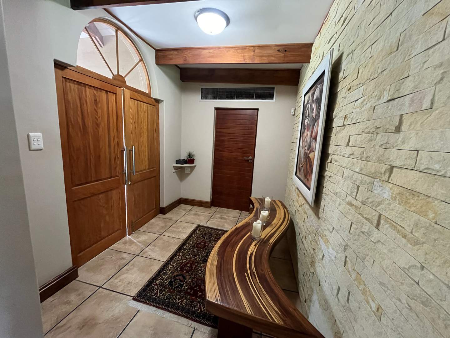A striking large wooden front door welcomes you into an impressive entrance hall, setting the tone for the elegant interiors that follow. The home boasts expansive open-plan living spaces, including a sophisticated lounge, dining area, and a spacious TV/family room with built-in braai, designed for effortless entertaining and relaxed family living.
