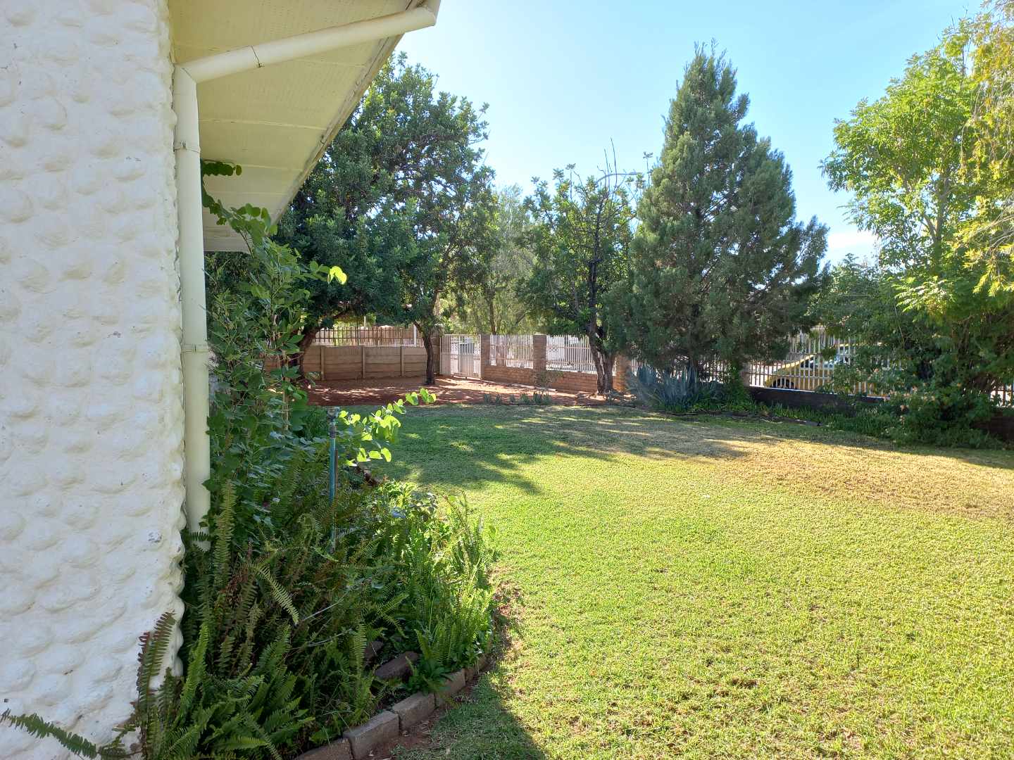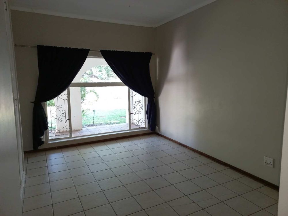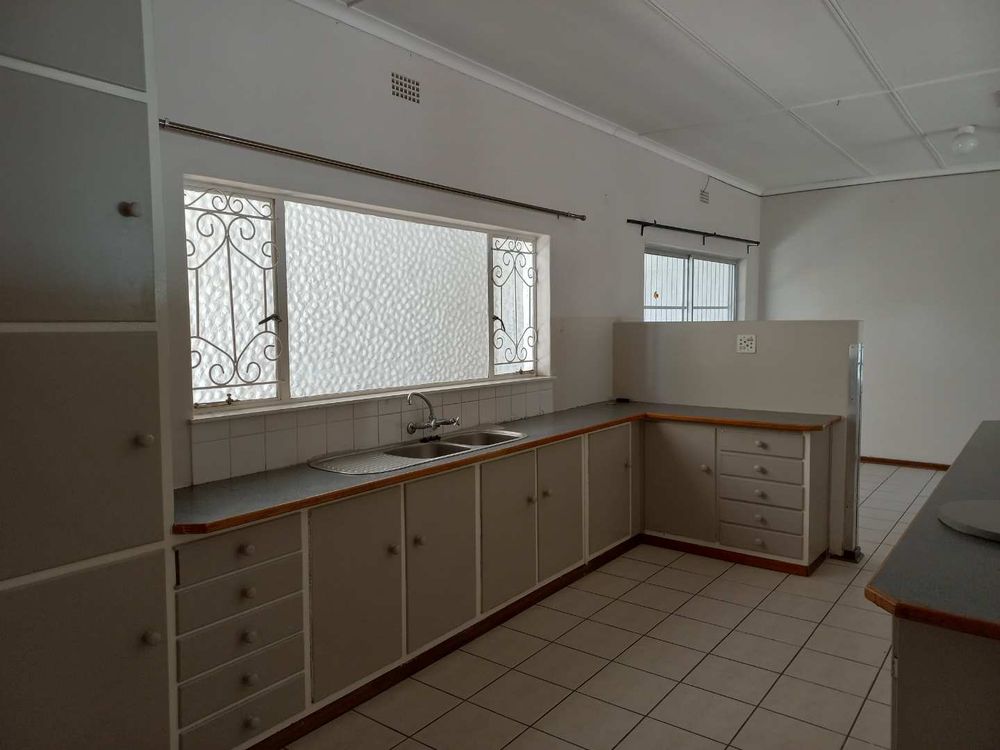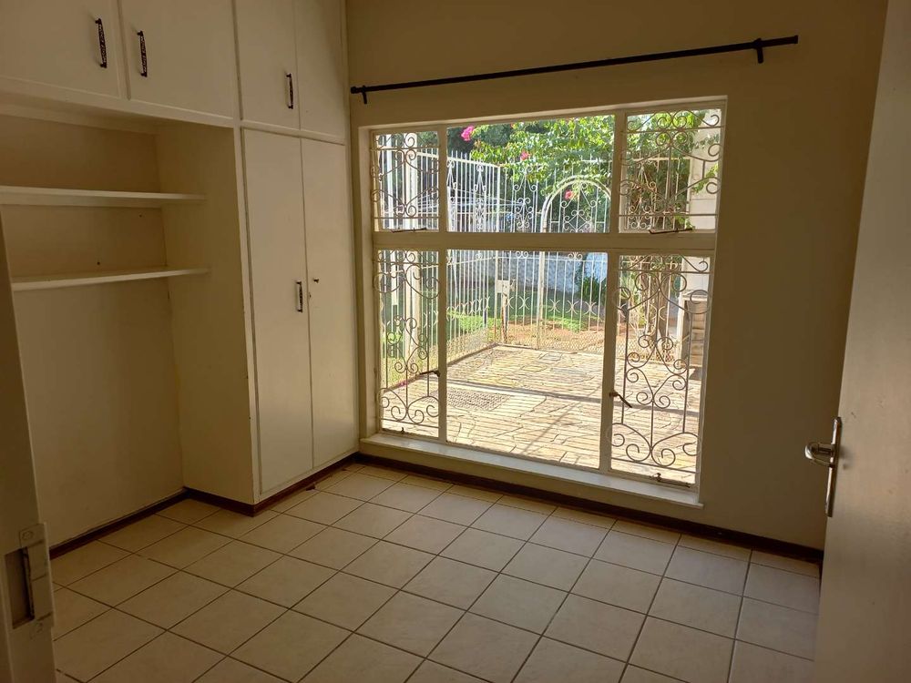 The house offers 3 very spacious bedrooms and a 4th smaller bedroom which can also be used as a study. All the bedrooms have built-in cupboards. The main bedroom is build on master scale with built-in cupboards galore, and its own en-suit and full bathroom. The other bathroom has a bath, basin and separate toilet. On entering the front door and entrance hall, you are welcomed by a very large open plan family, dining room and kitchen. Sliding doors open on a large patio with built-in braai. A very nice entertainment area! The outbuildings consist out of a double garage and 2 rooms with a shower and toilet. These areas can be used as a storeroom and laundry, or you can convert it into a batchelor’s flat for an extra income or even an extra guest room. The garden has auto irrigation and is very well kept. The property is secured with burglar bars and is totally walled.