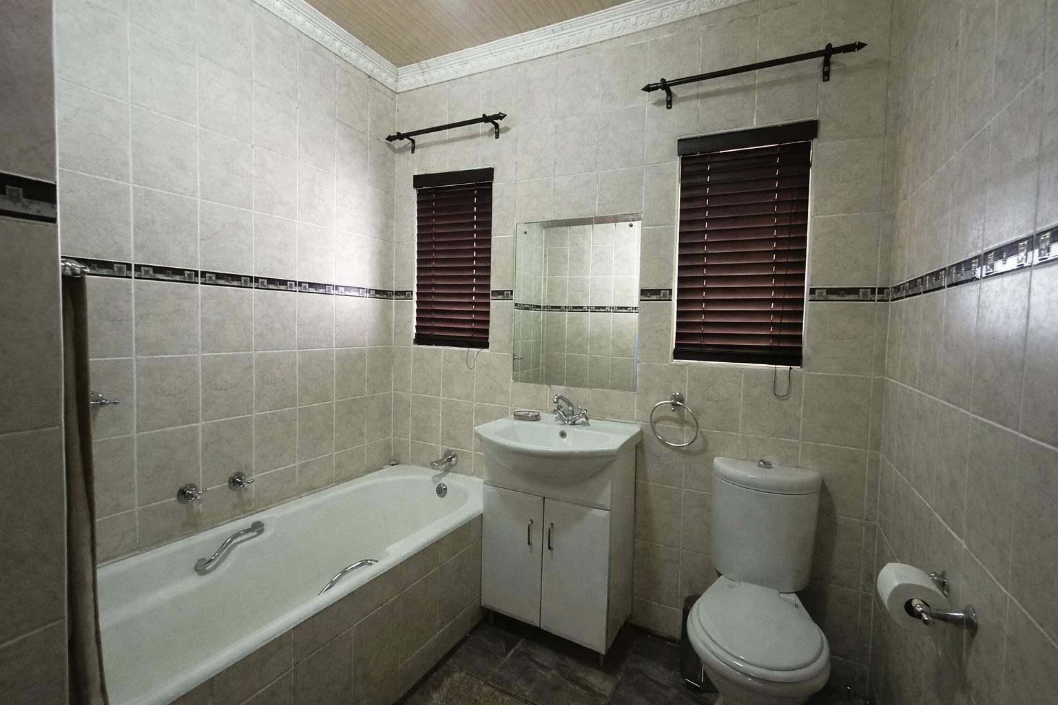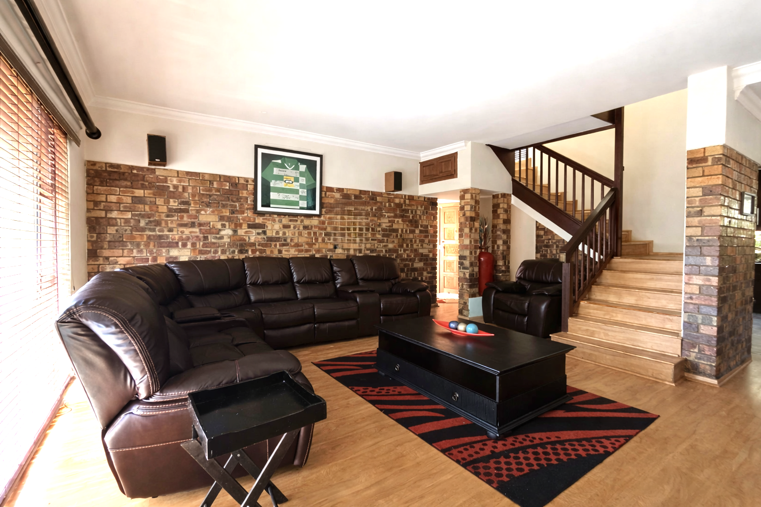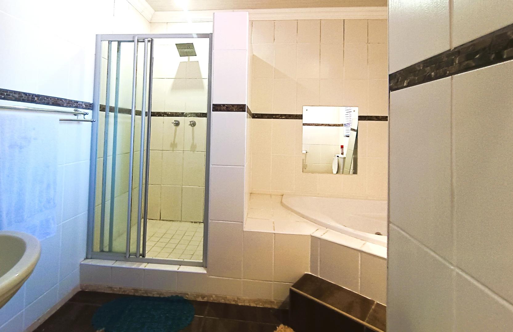 On the ground floor, you’ll find three bedrooms, including a generously sized main bedroom with plenty of built-in cupboards, air conditioning, and an en-suite bathroom. A second bathroom services the remaining two bedrooms.